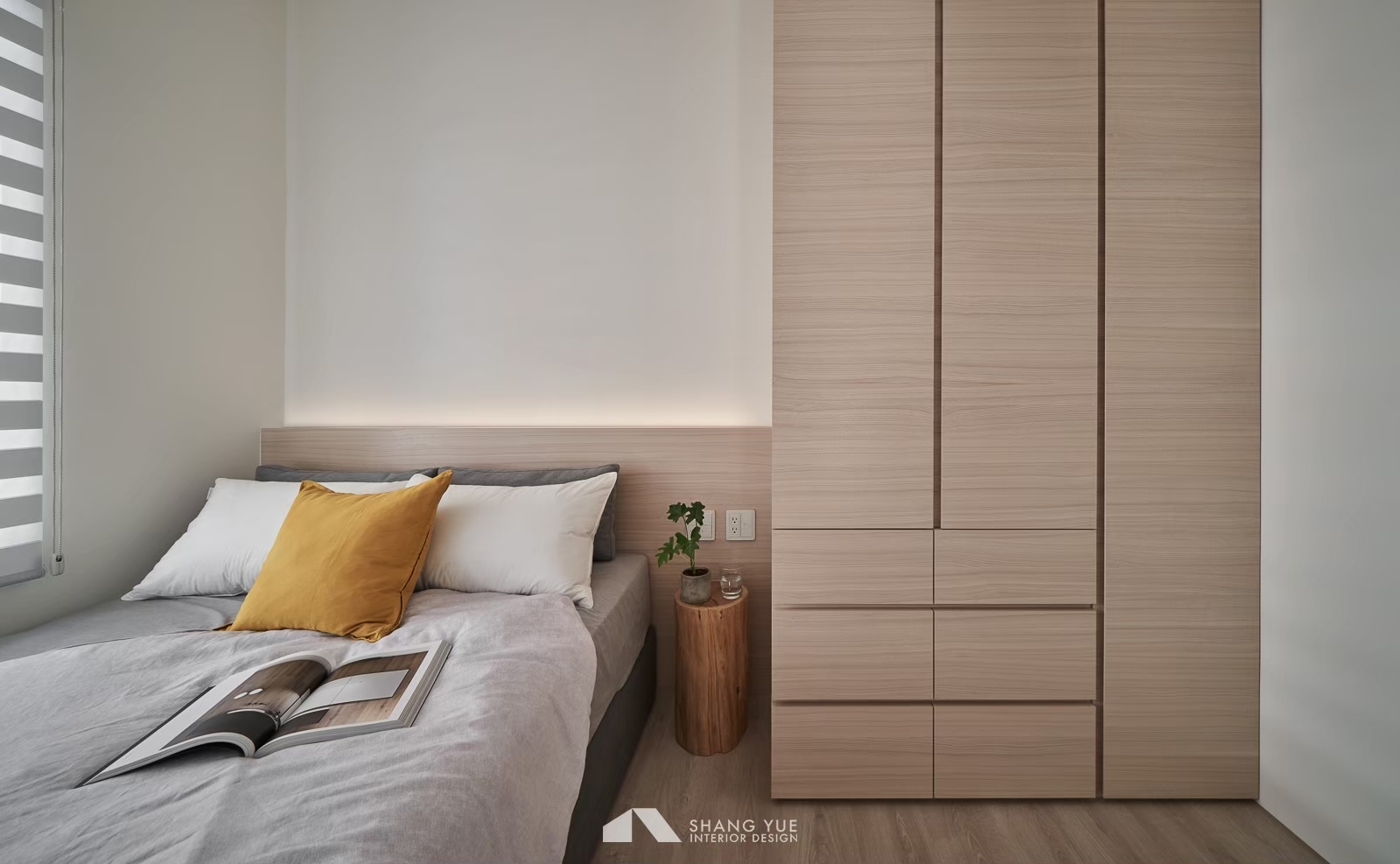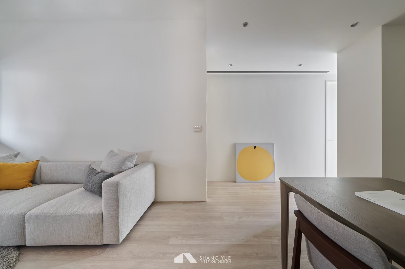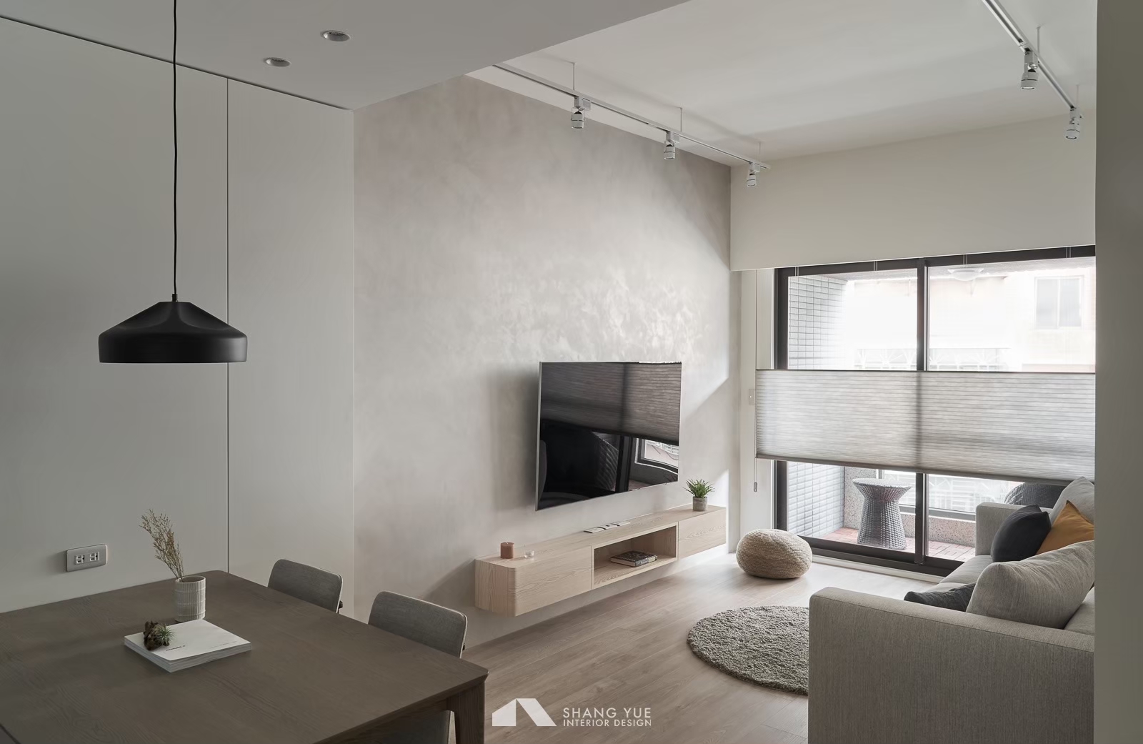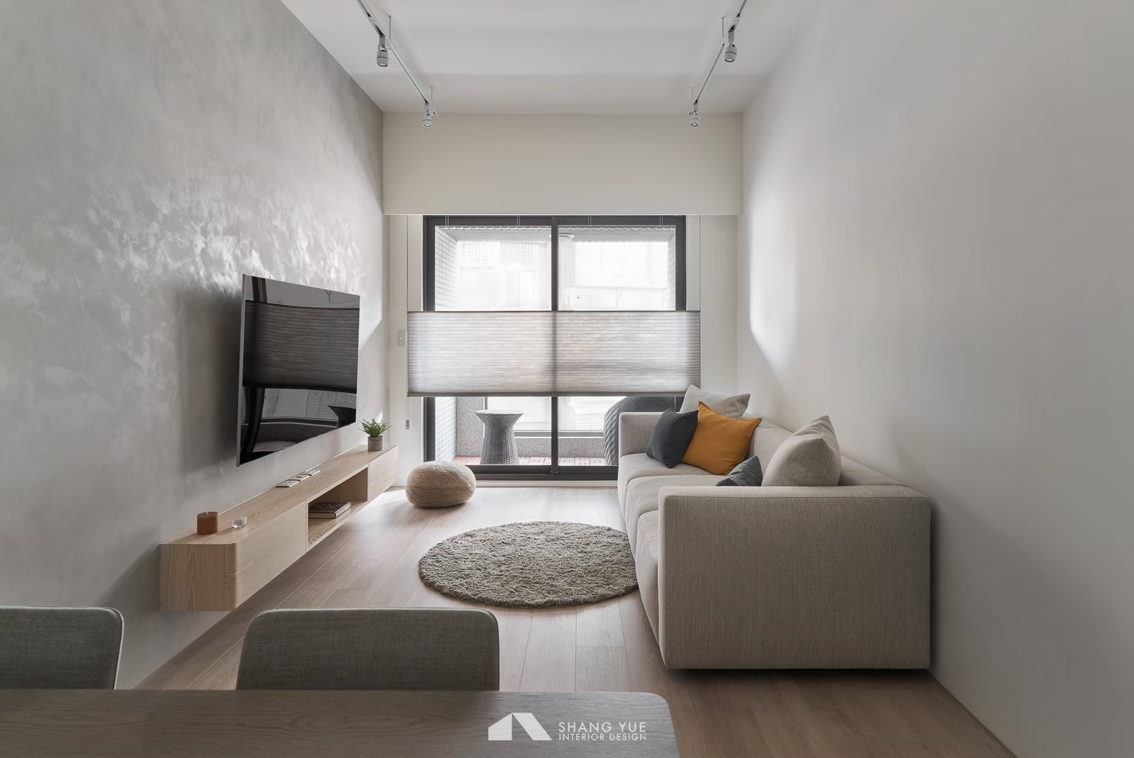 午後的陽光輕輕穿過半開的蜂巢簾,在地板與沙發上灑下柔和光影。簡約的米色沙發沿牆而置,飽滿的比例與厚實坐感,承接著日常裡的每一次放鬆。 幾顆跳色抱枕為空間添上一抹輕快,如同靜謐畫面中的輕聲問候,溫柔地收攏起節奏,在小而恰好的尺度中,藏著生活最純粹的片段。