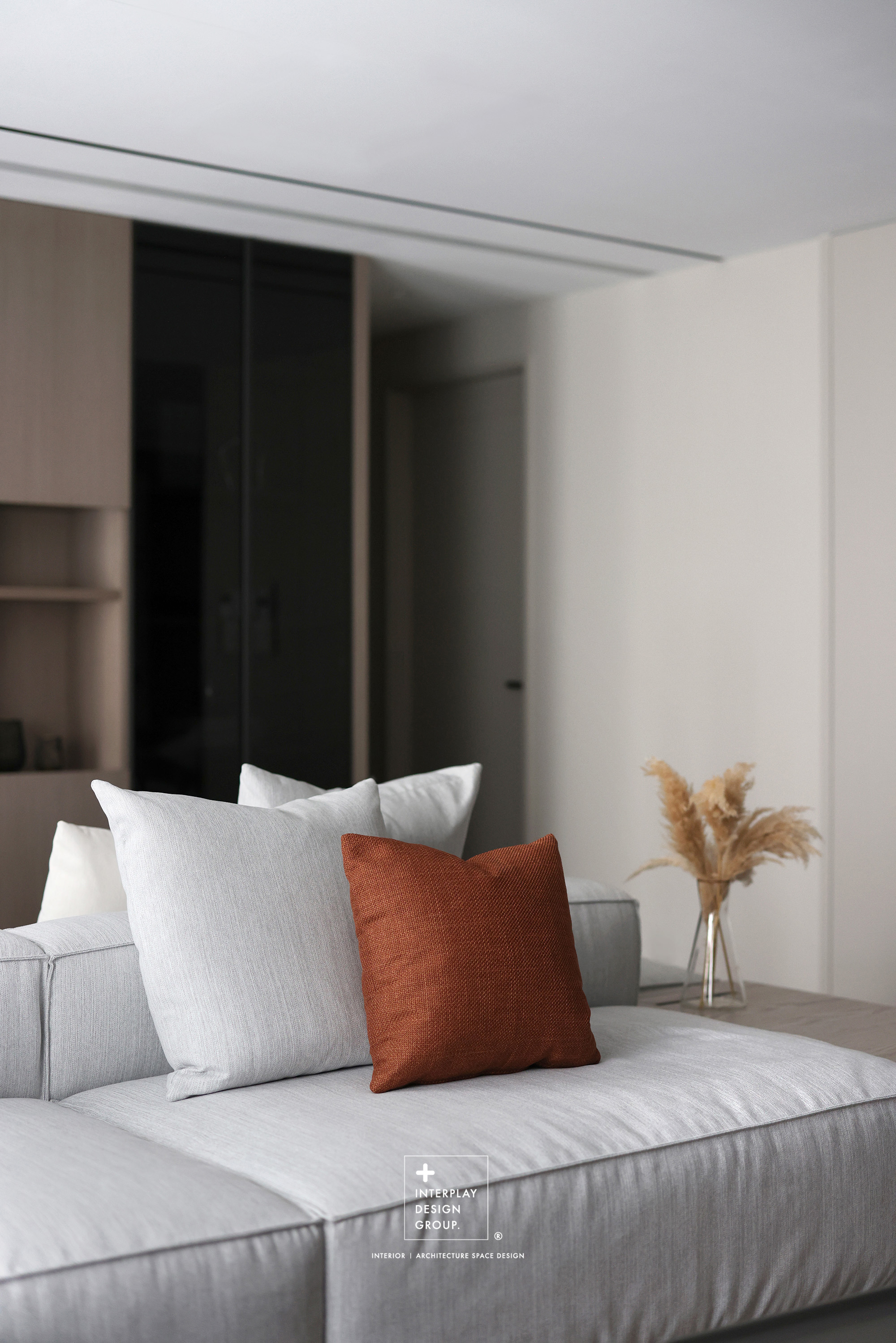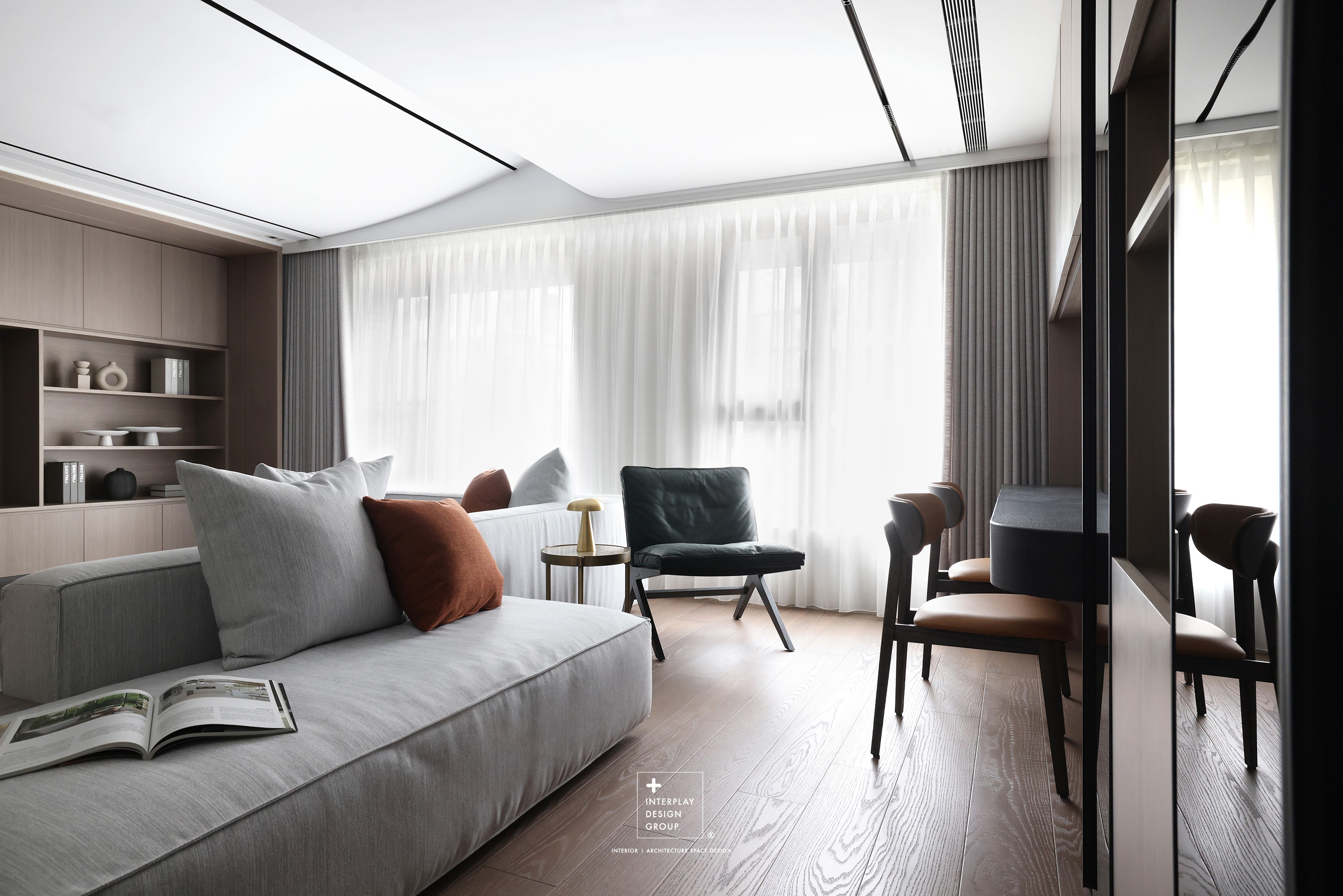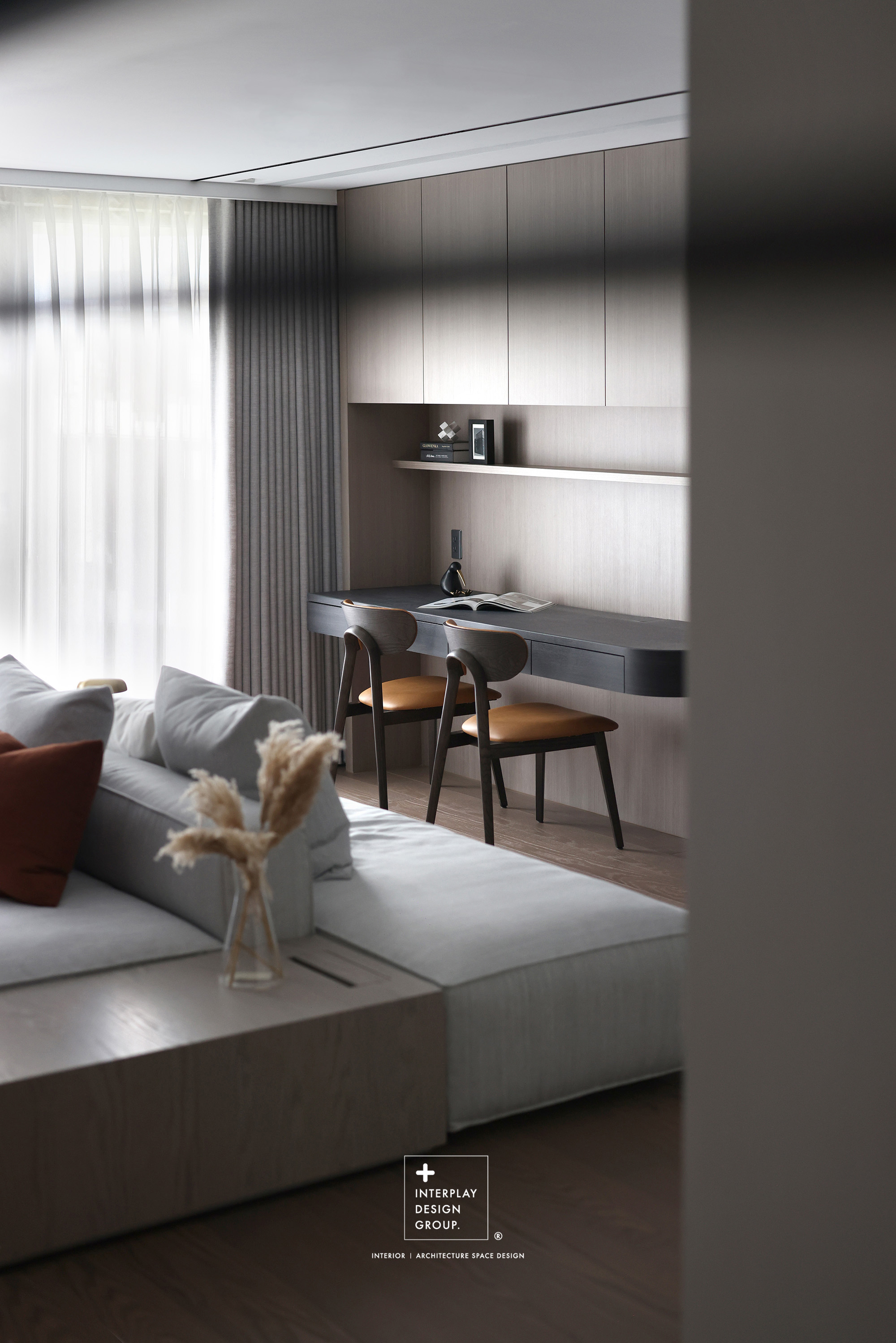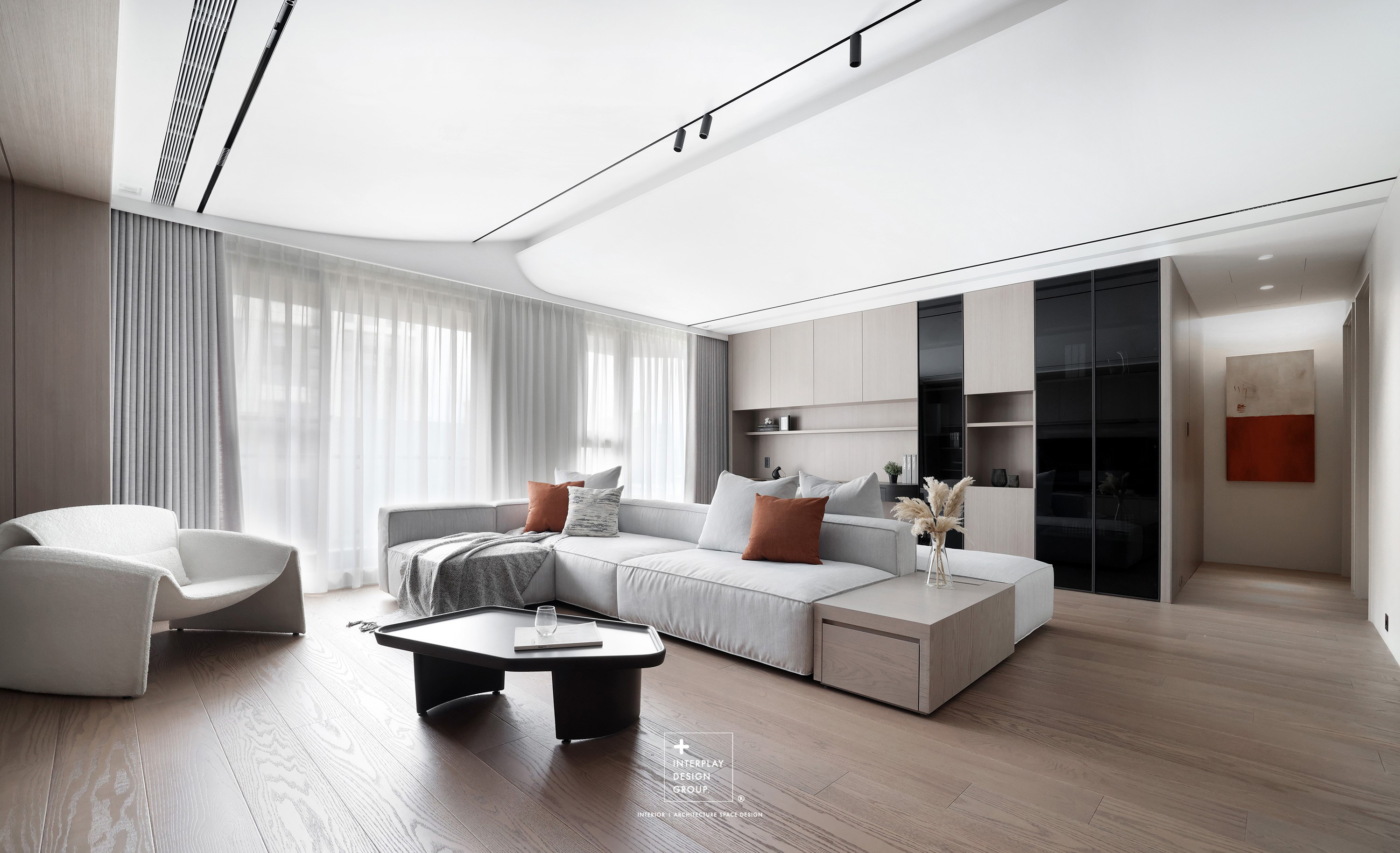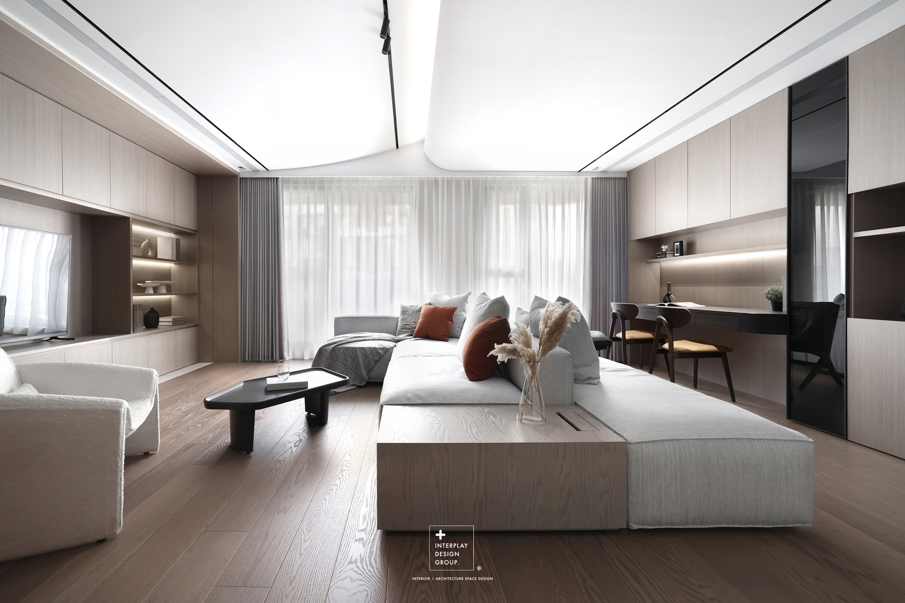 輕柔的自然光透過窗紗灑落,安靜鋪滿整個客廳。淺灰色L型沙發以寬闊姿態攤展於空間中央,材質柔和,靠墊與地毯輕輕堆疊,構築出一種無需多語的舒適氛圍。 咖啡桌線條俐落,如同黑與木質之間的停頓符號,簡潔卻有重量。背牆櫃體以淺木搭配黑玻構成收納節奏,安靜地整理日常的片段。整體空間以米白、柔灰、淺木鋪陳出一種「輕」的節奏,在留白與比例之間,藏著對生活節奏的溫柔掌握。