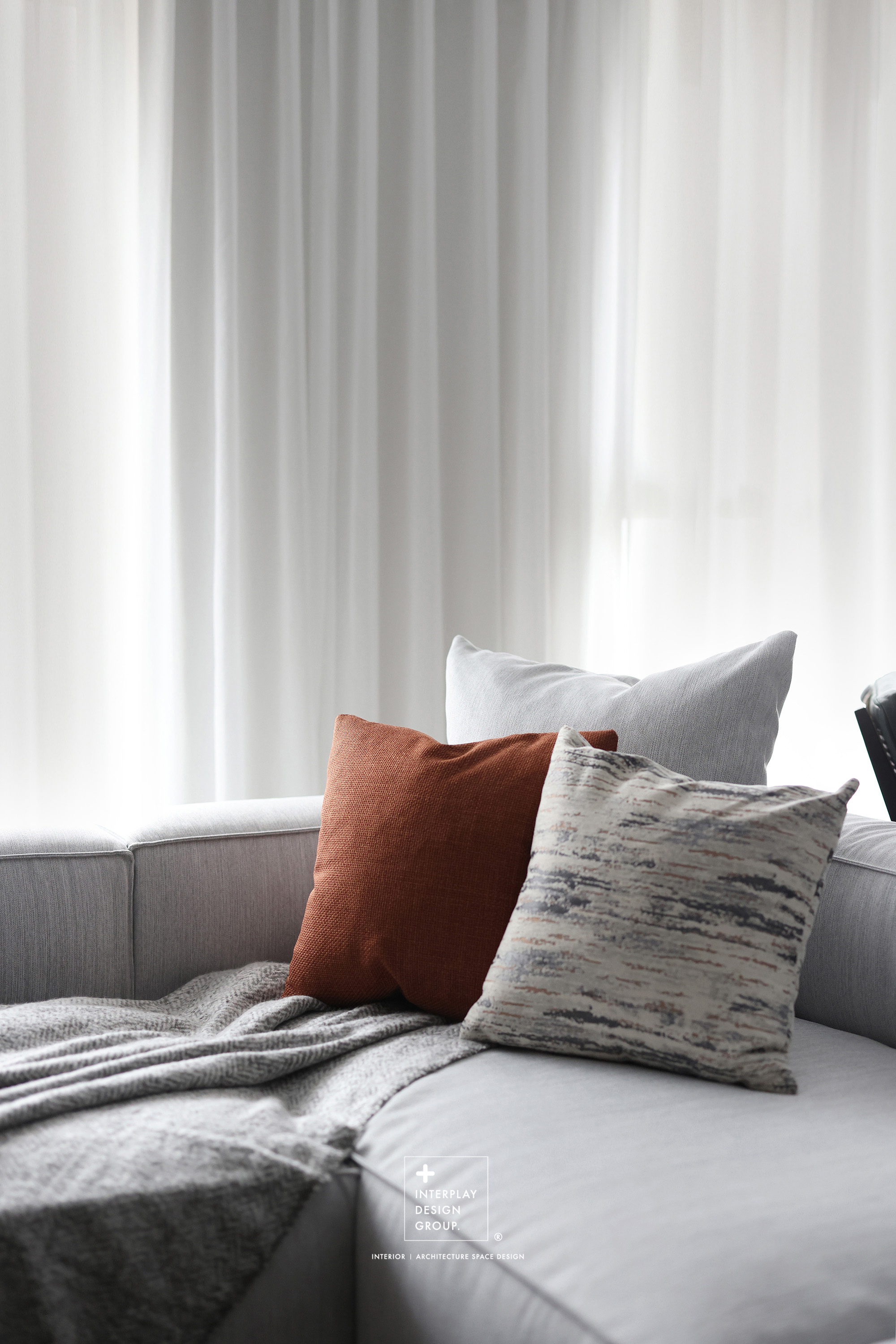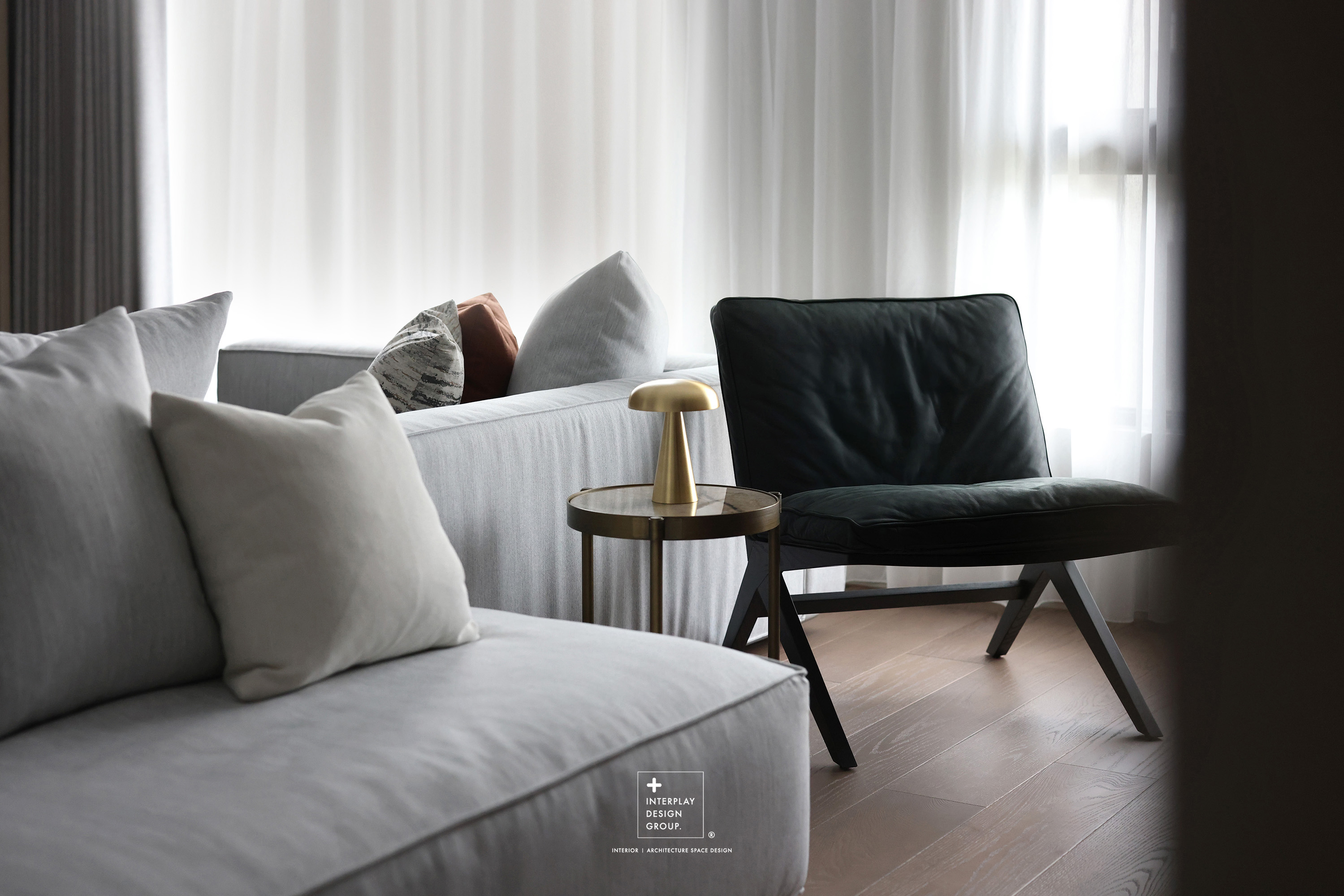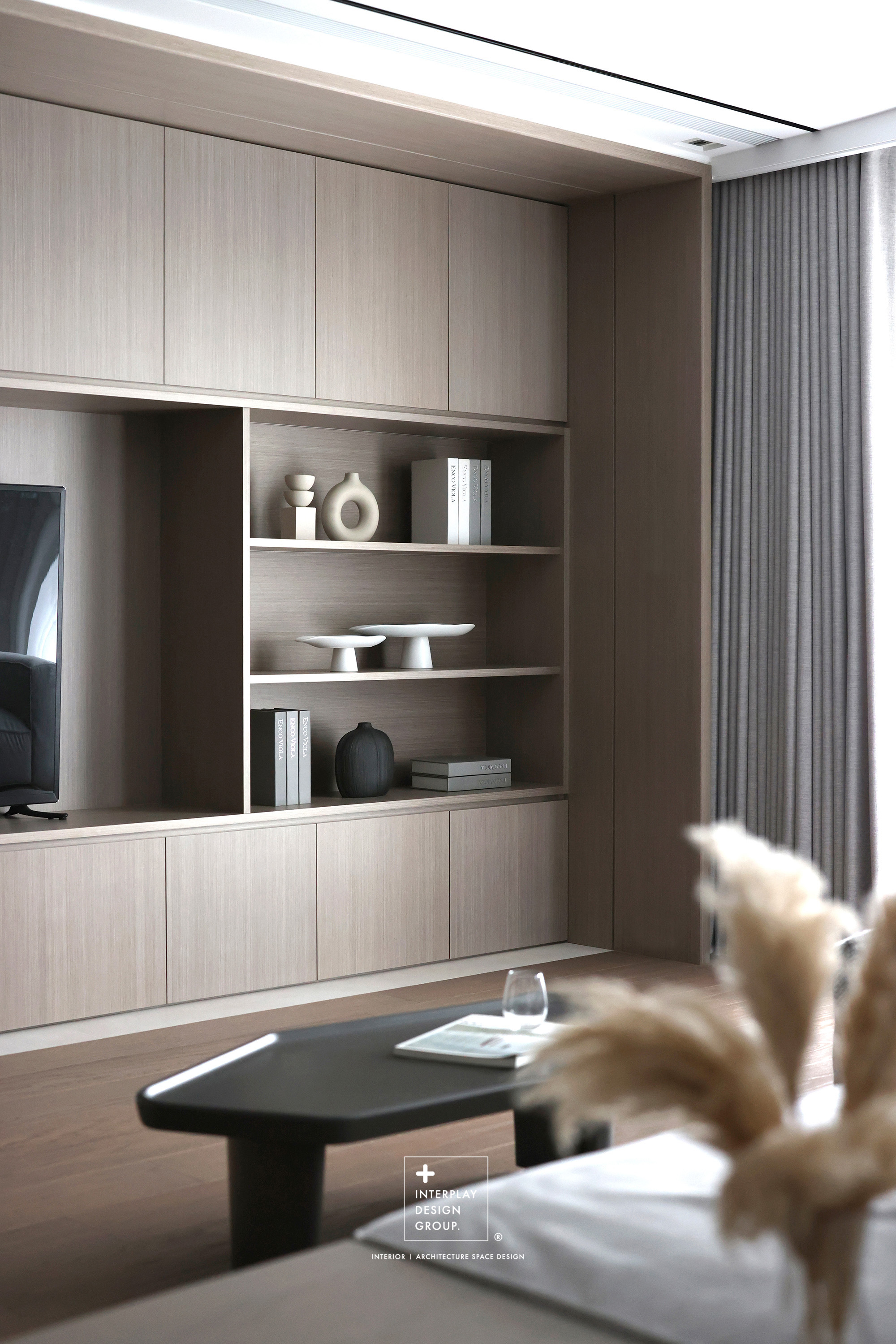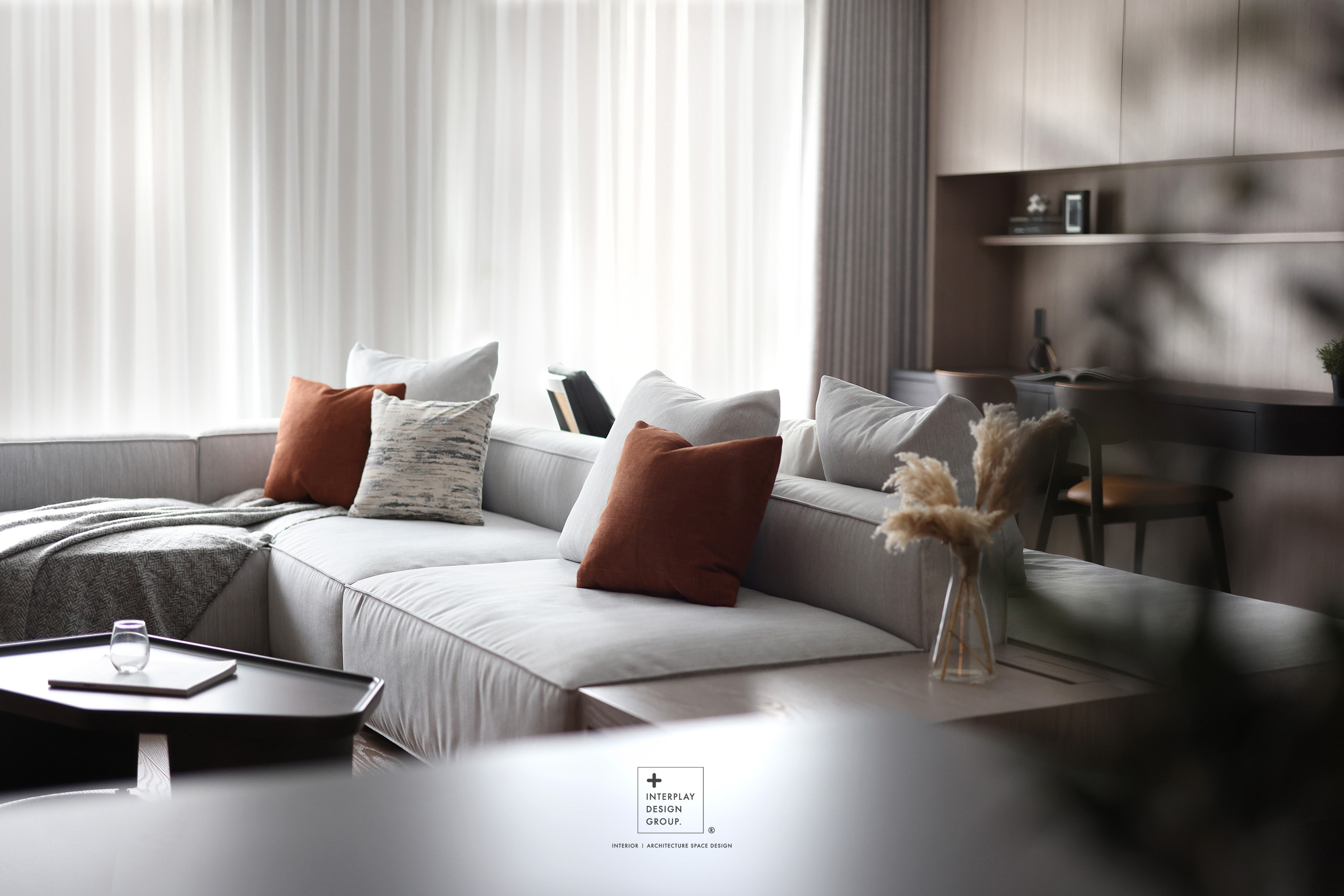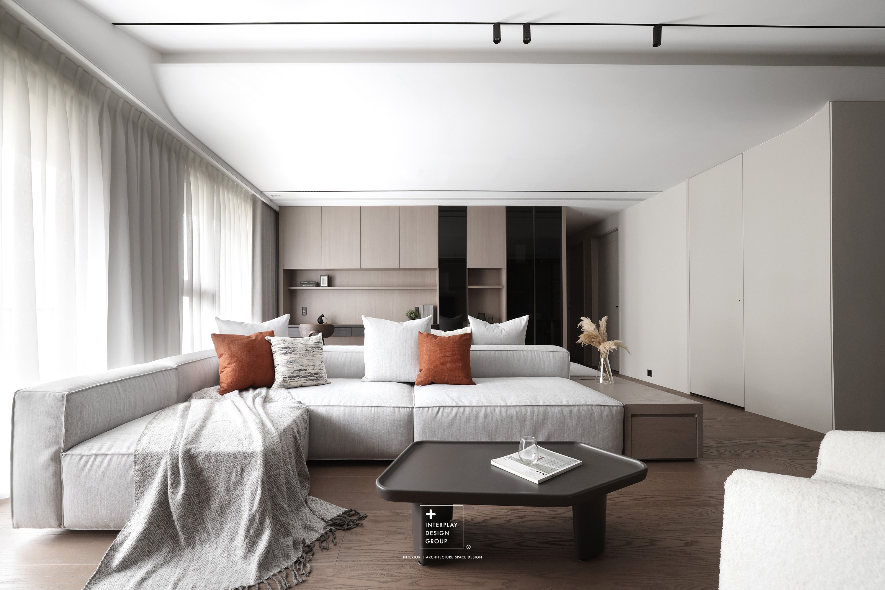 輕柔的自然光透過窗紗灑落,安靜鋪滿整個客廳。淺灰色L型沙發以寬闊姿態攤展於空間中央,材質柔和,靠墊與地毯輕輕堆疊,構築出一種無需多語的舒適氛圍。 咖啡桌線條俐落,如同黑與木質之間的停頓符號,簡潔卻有重量。背牆櫃體以淺木搭配黑玻構成收納節奏,安靜地整理日常的片段。整體空間以米白、柔灰、淺木鋪陳出一種「輕」的節奏,在留白與比例之間,藏著對生活節奏的溫柔掌握。