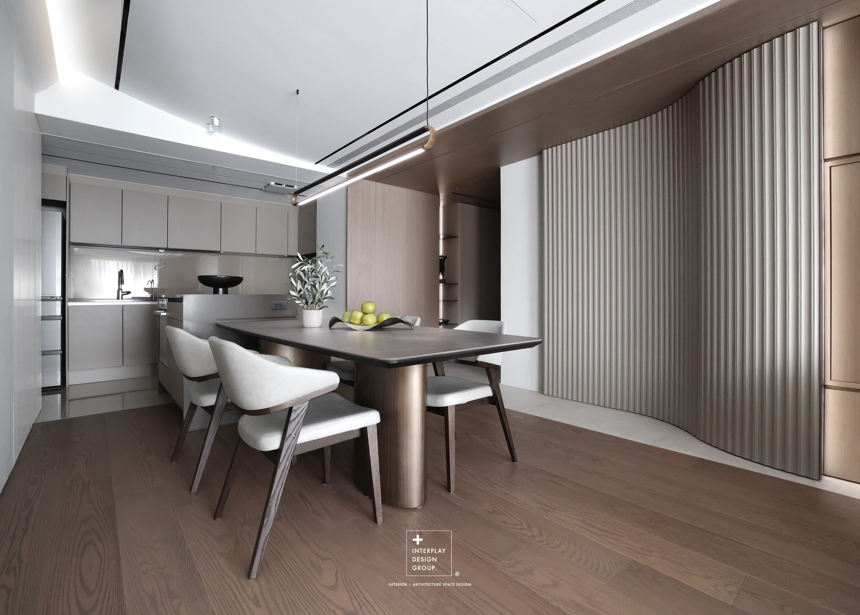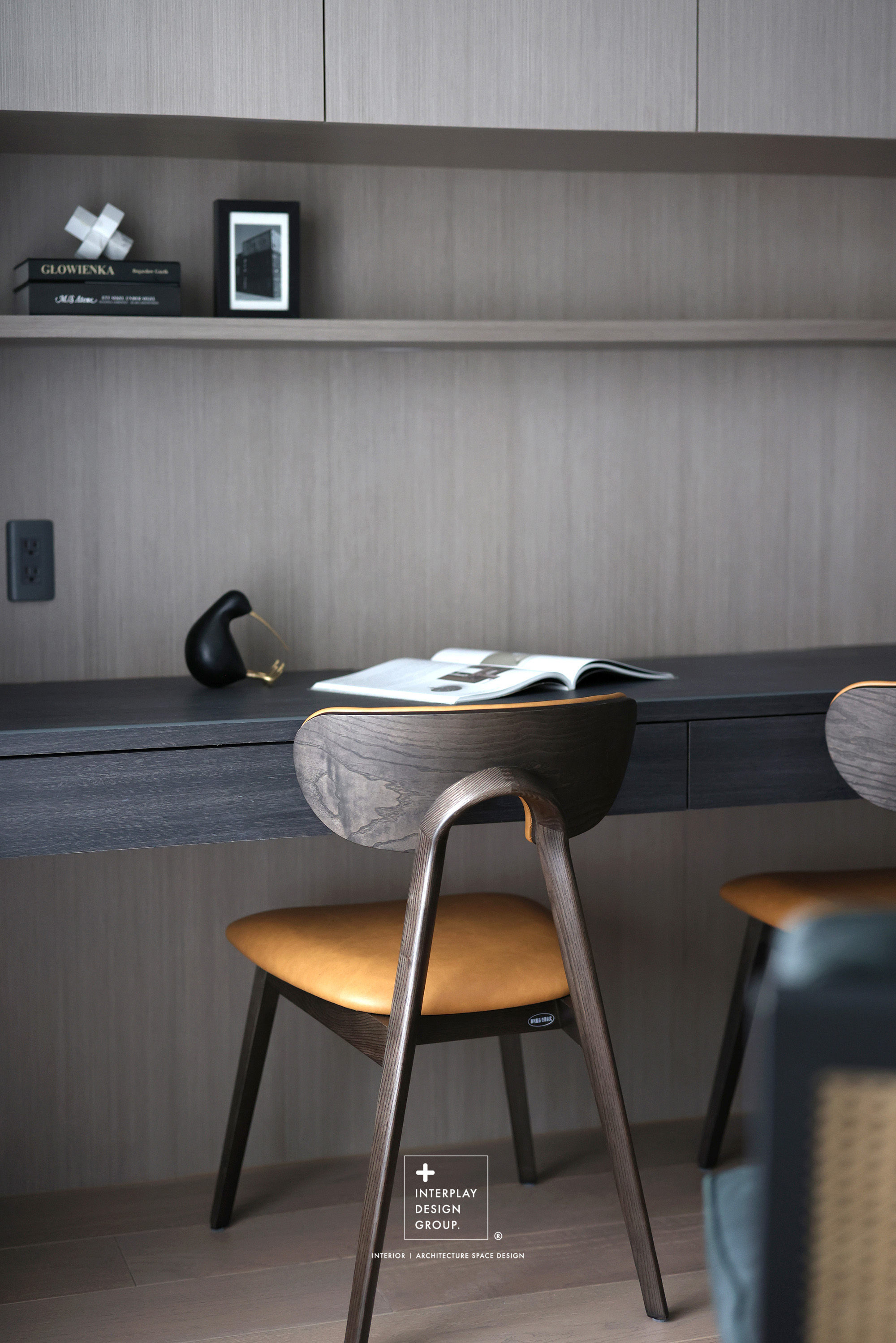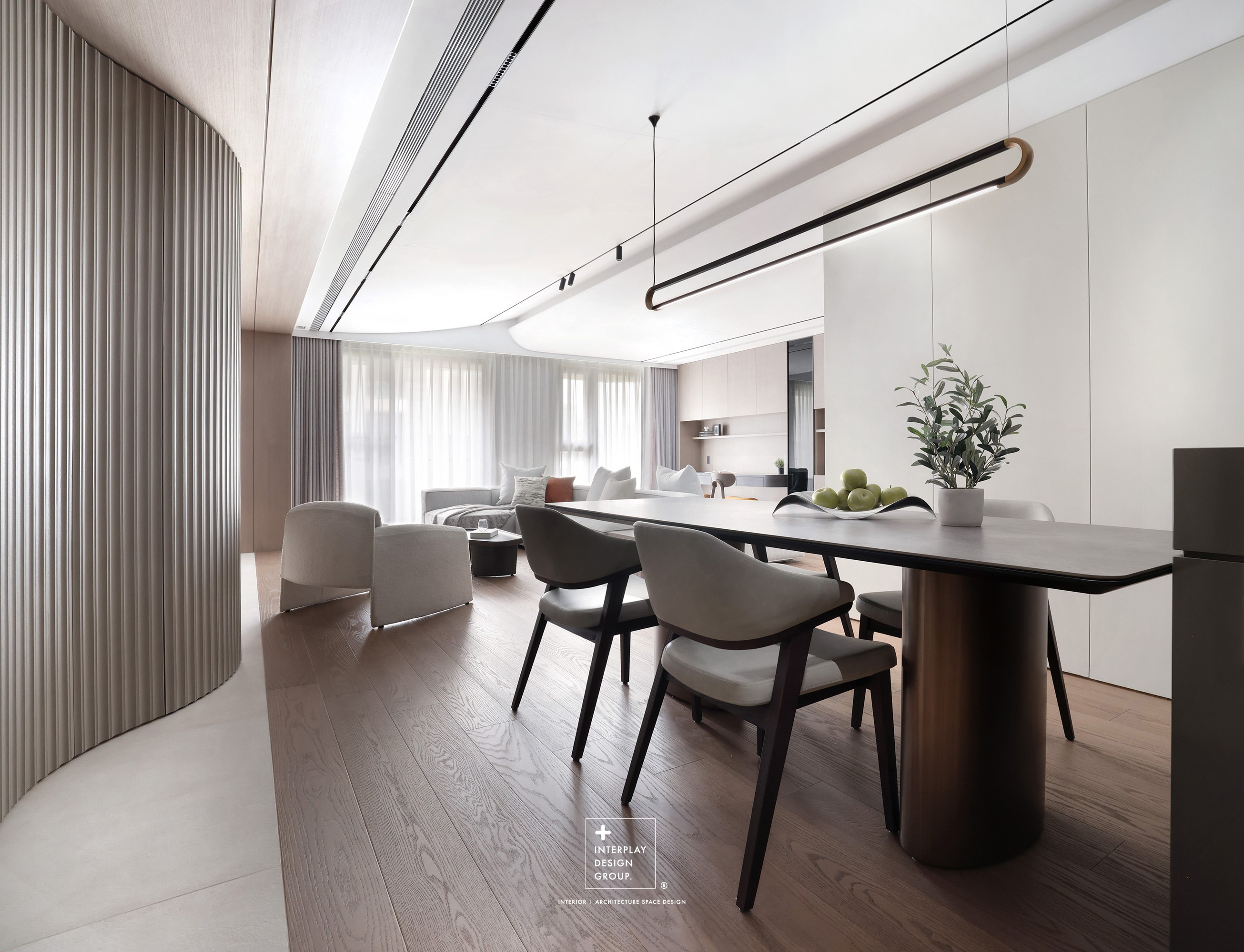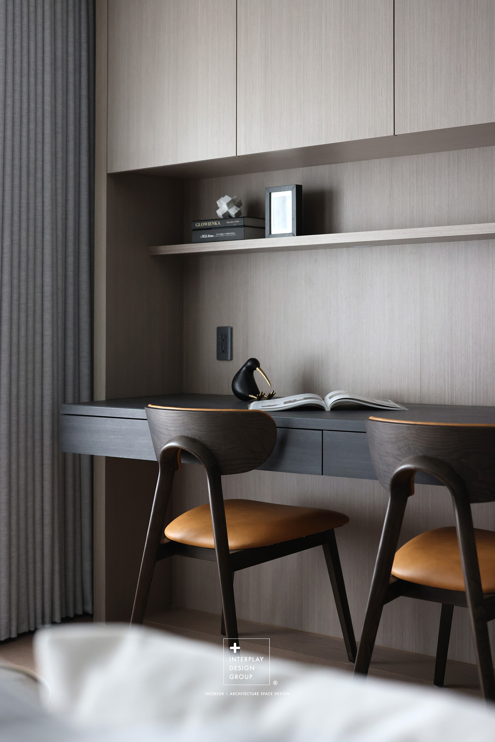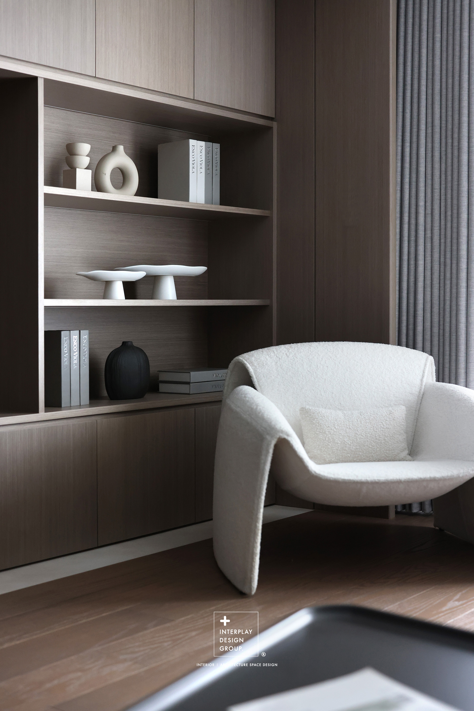 輕柔的自然光透過窗紗灑落,安靜鋪滿整個客廳。淺灰色L型沙發以寬闊姿態攤展於空間中央,材質柔和,靠墊與地毯輕輕堆疊,構築出一種無需多語的舒適氛圍。 咖啡桌線條俐落,如同黑與木質之間的停頓符號,簡潔卻有重量。背牆櫃體以淺木搭配黑玻構成收納節奏,安靜地整理日常的片段。整體空間以米白、柔灰、淺木鋪陳出一種「輕」的節奏,在留白與比例之間,藏著對生活節奏的溫柔掌握。
