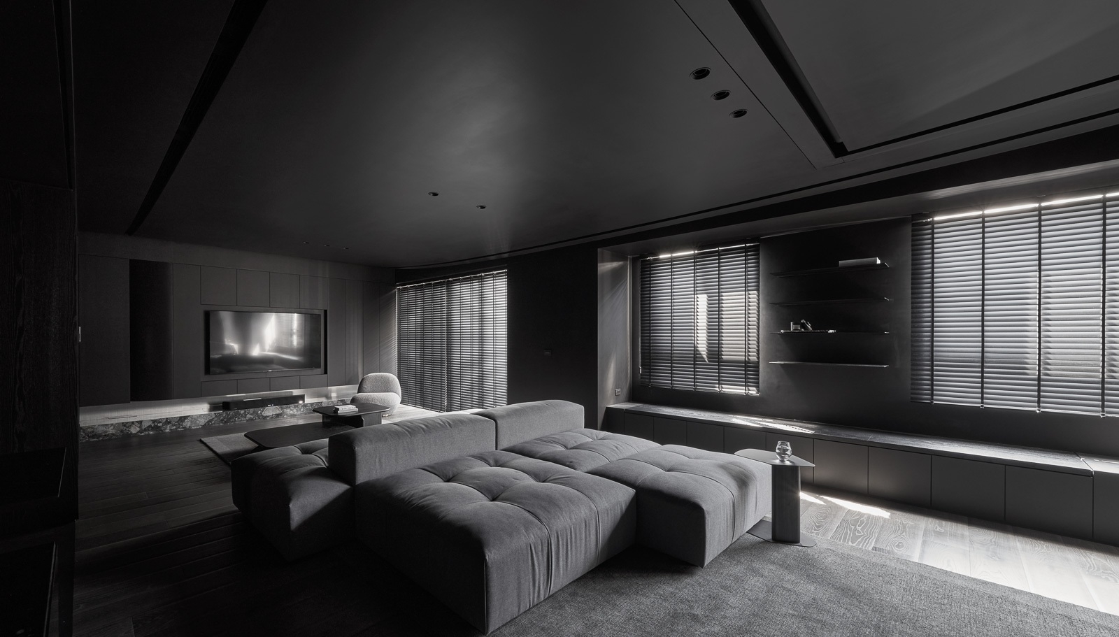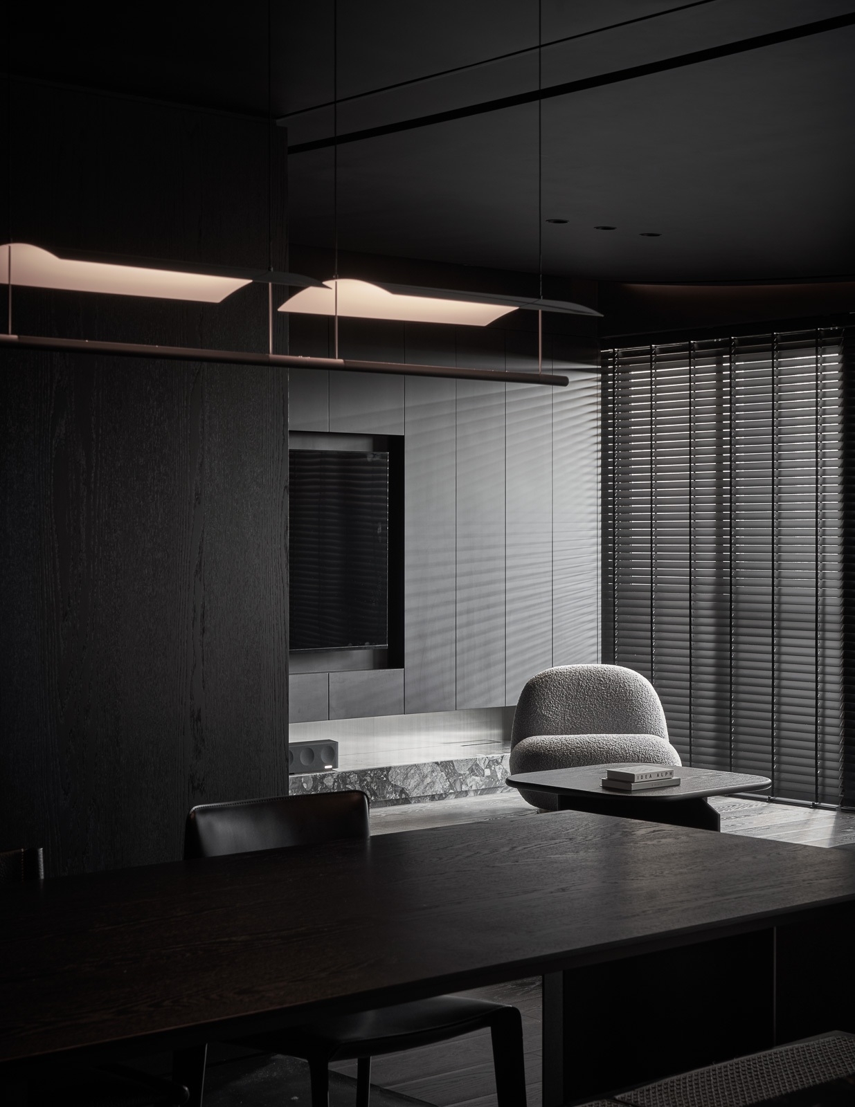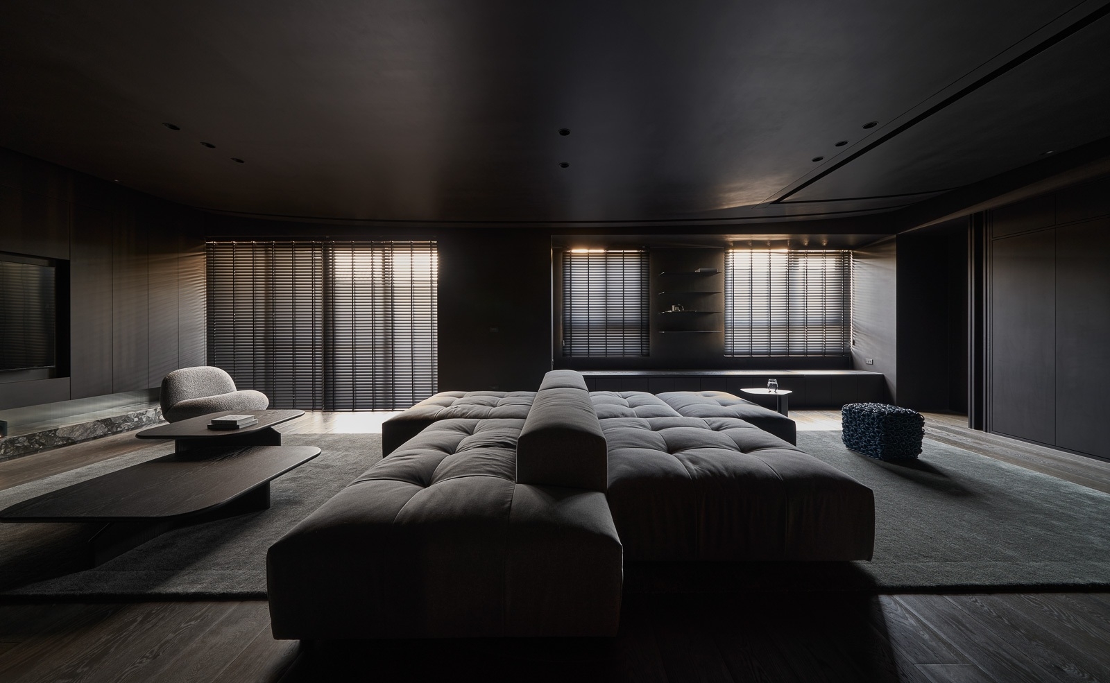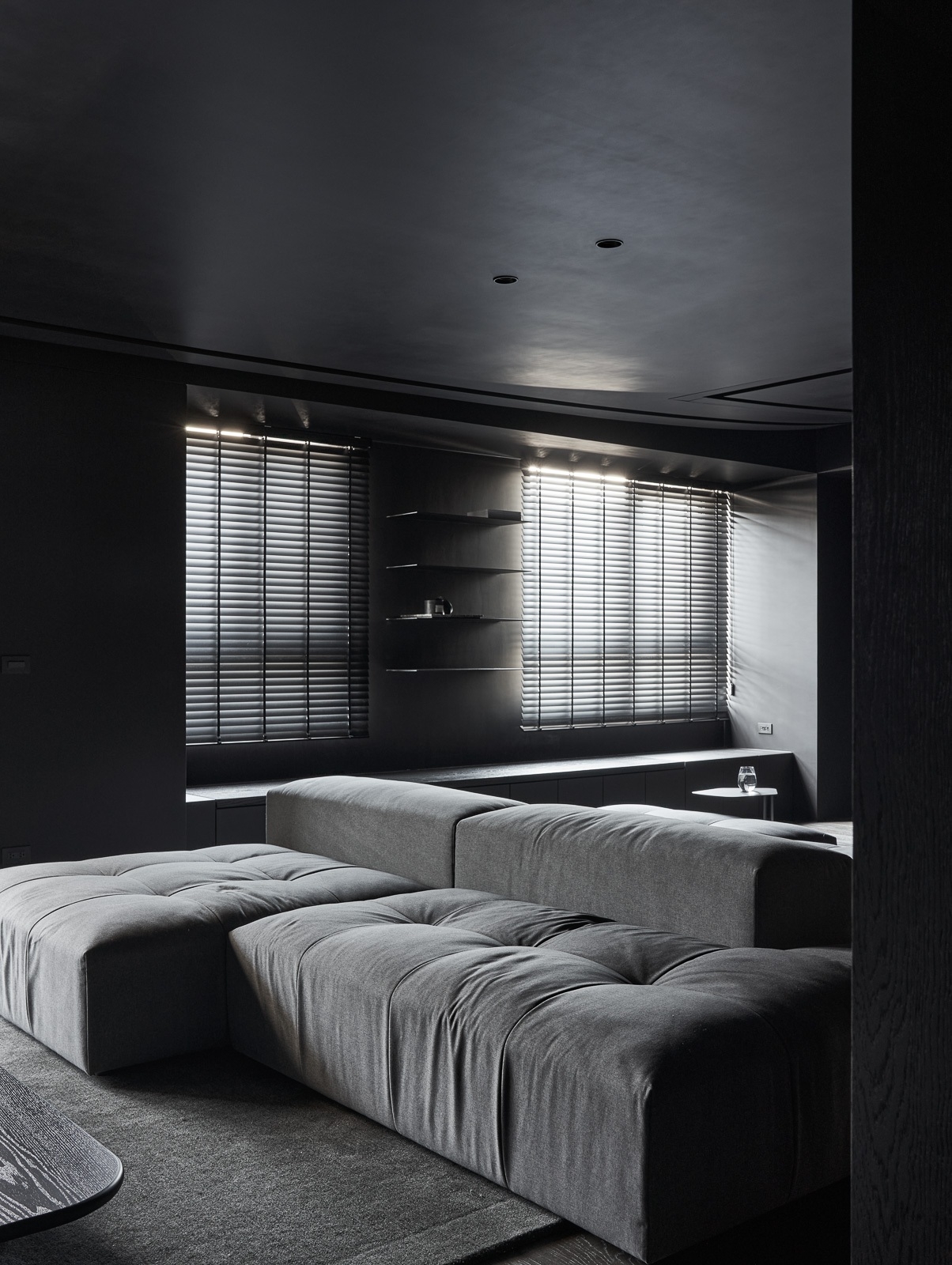 微光穿過百葉,靜靜鋪在深色木地板與傢俱之上,像是無聲地低語。沙發以低伏而寬闊的姿態,安穩地佔據空間中央,厚實的坐感彷彿隨時準備擁抱一場漫長的靜默。 其他傢俱線條俐落,深灰色調與空間融為一體,收斂而有力。黑色天花緩緩延伸,讓整個場域像是被柔軟地包覆,時間在這裡放慢了節奏,光影與材質細細交織,一場屬於靜謐與自持的生活樂章,悄悄展開。