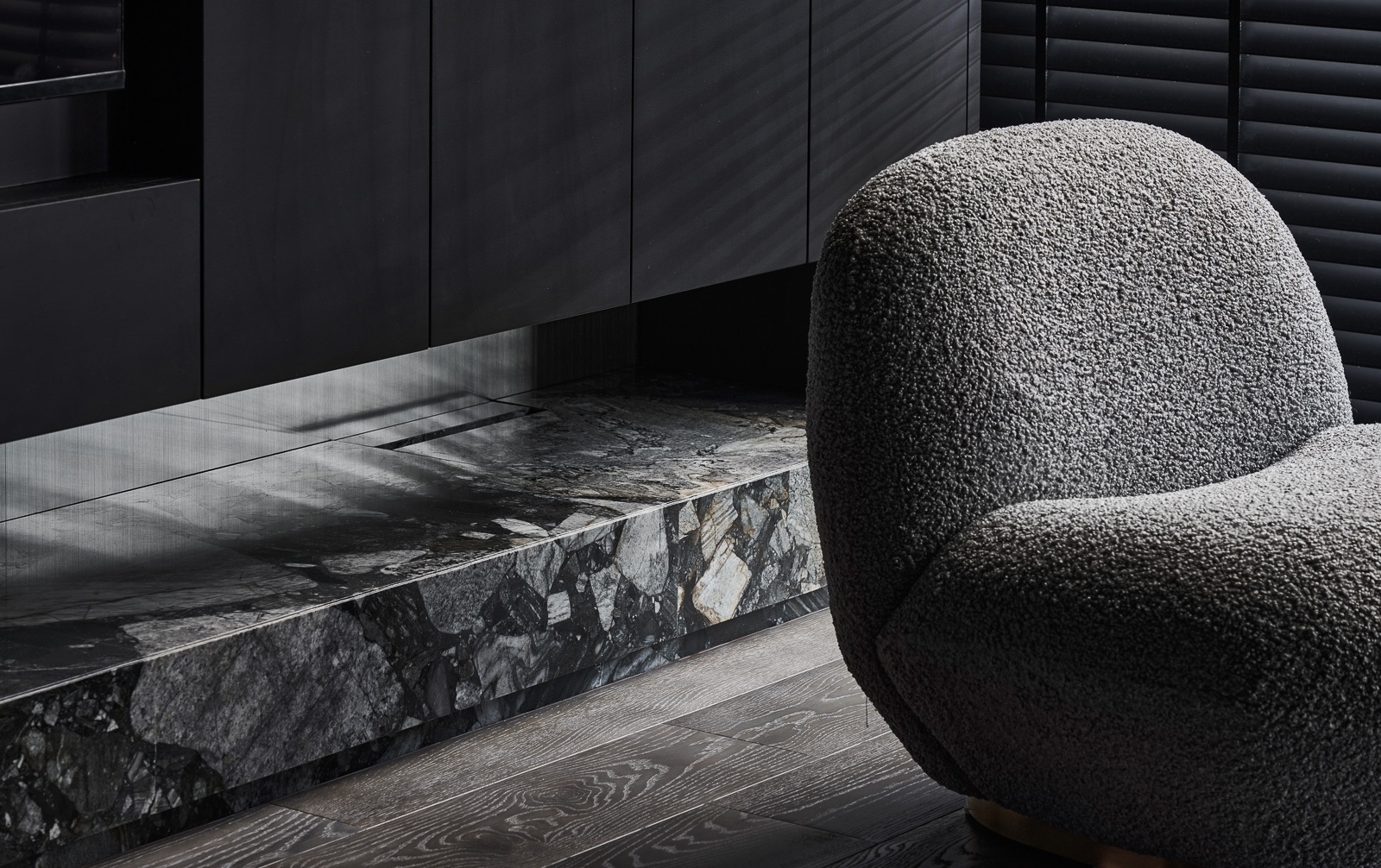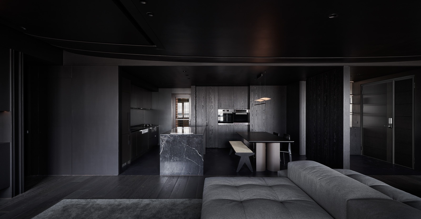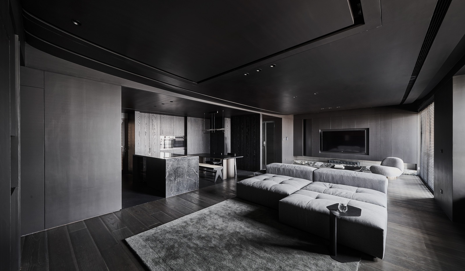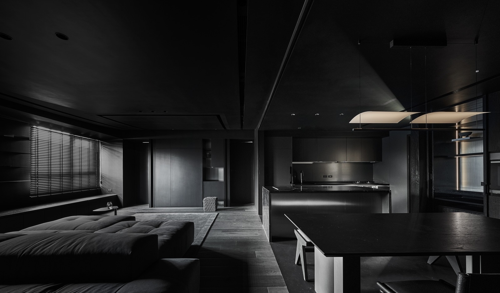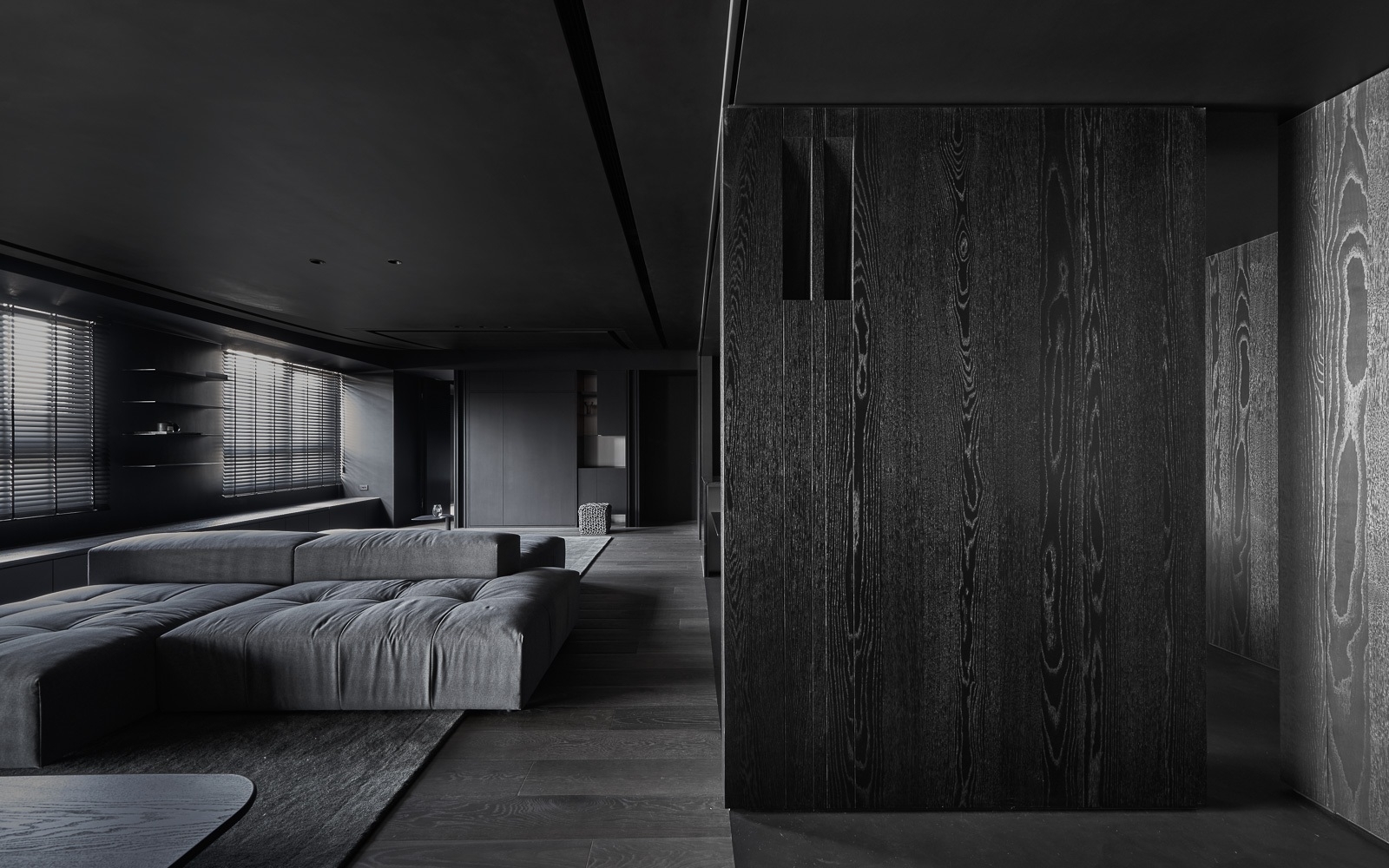 微光穿過百葉,靜靜鋪在深色木地板與傢俱之上,像是無聲地低語。沙發以低伏而寬闊的姿態,安穩地佔據空間中央,厚實的坐感彷彿隨時準備擁抱一場漫長的靜默。 其他傢俱線條俐落,深灰色調與空間融為一體,收斂而有力。黑色天花緩緩延伸,讓整個場域像是被柔軟地包覆,時間在這裡放慢了節奏,光影與材質細細交織,一場屬於靜謐與自持的生活樂章,悄悄展開。