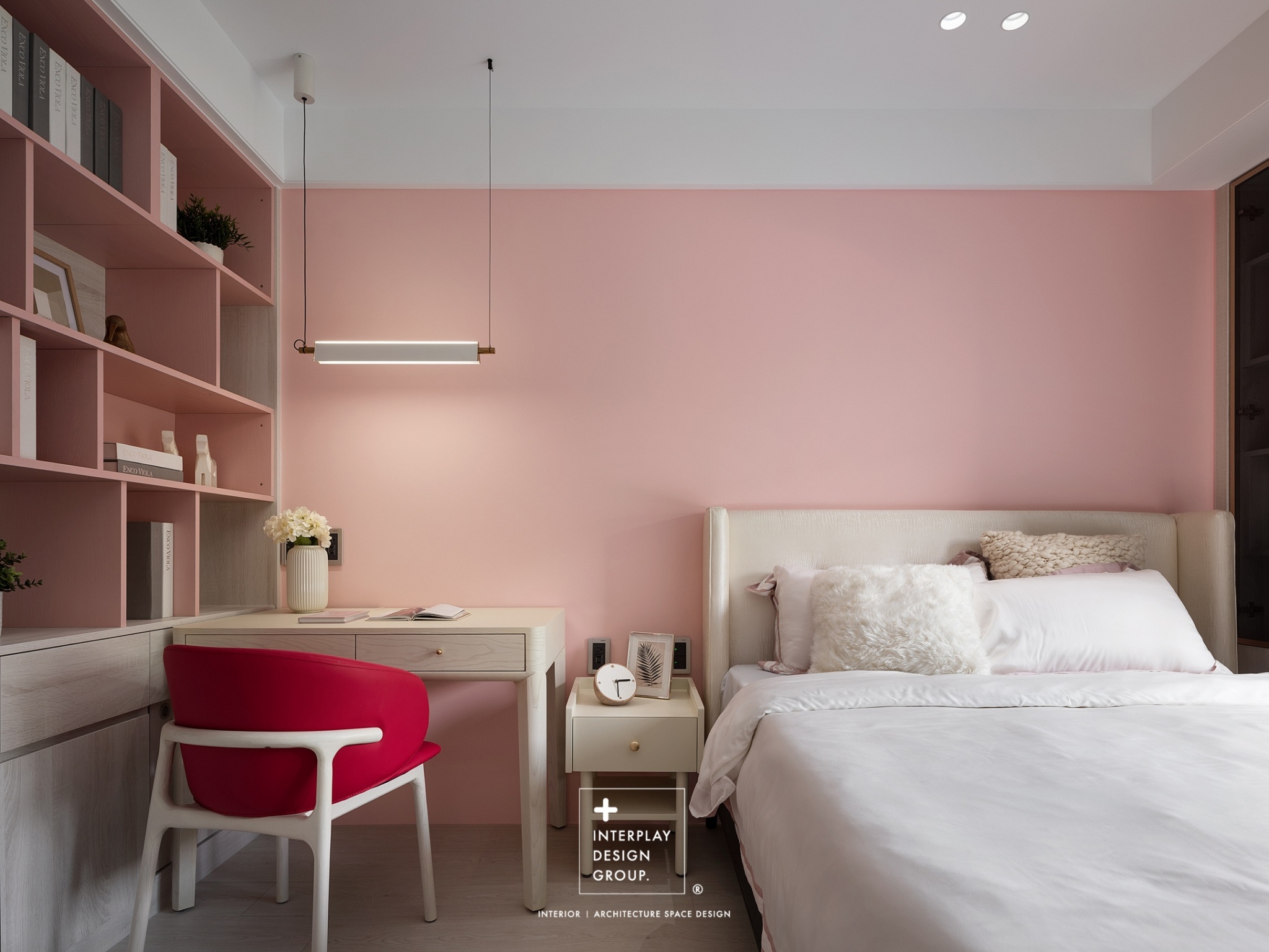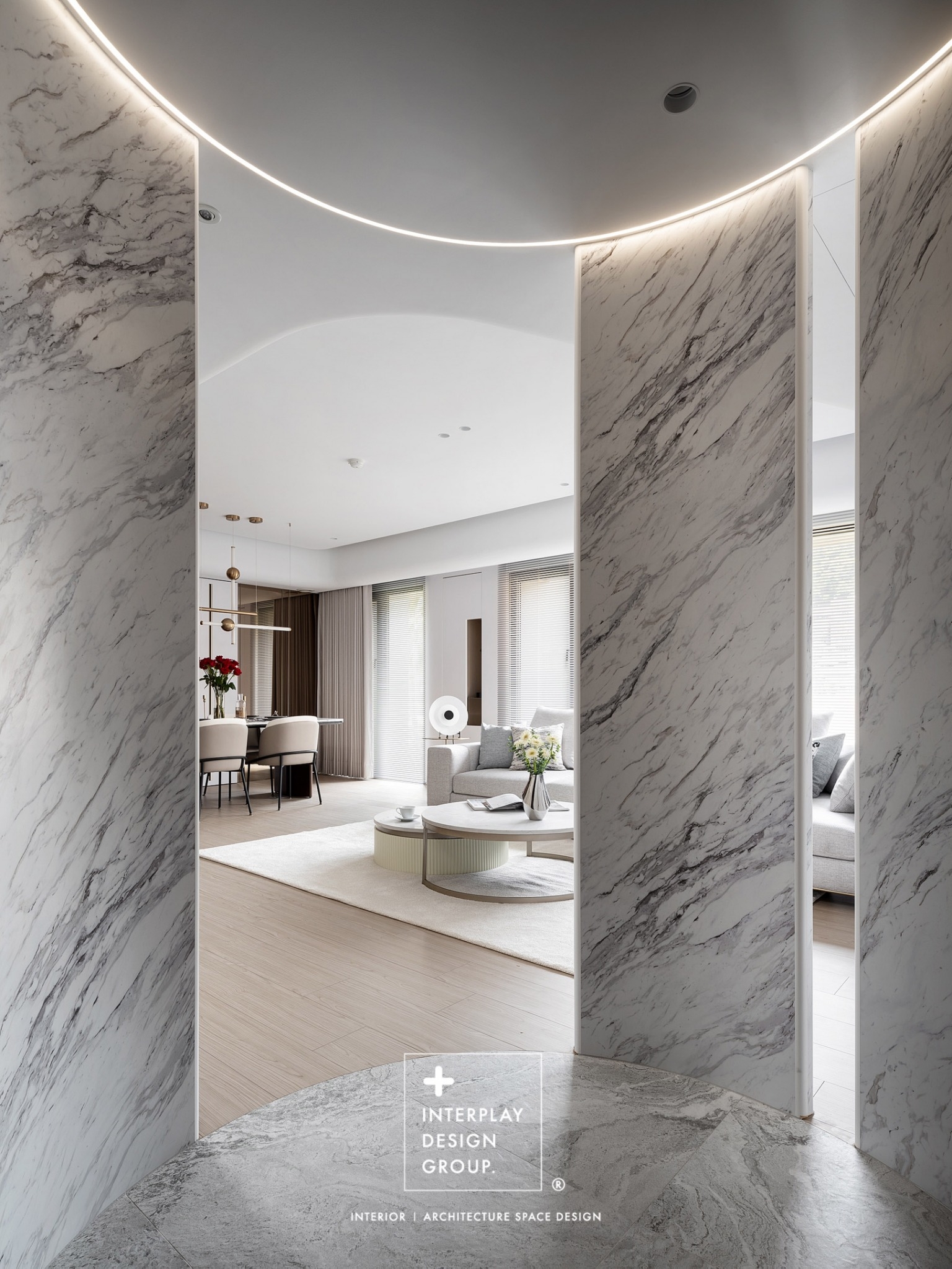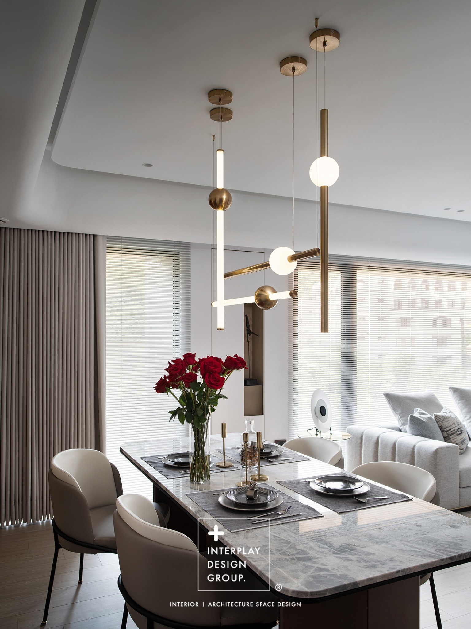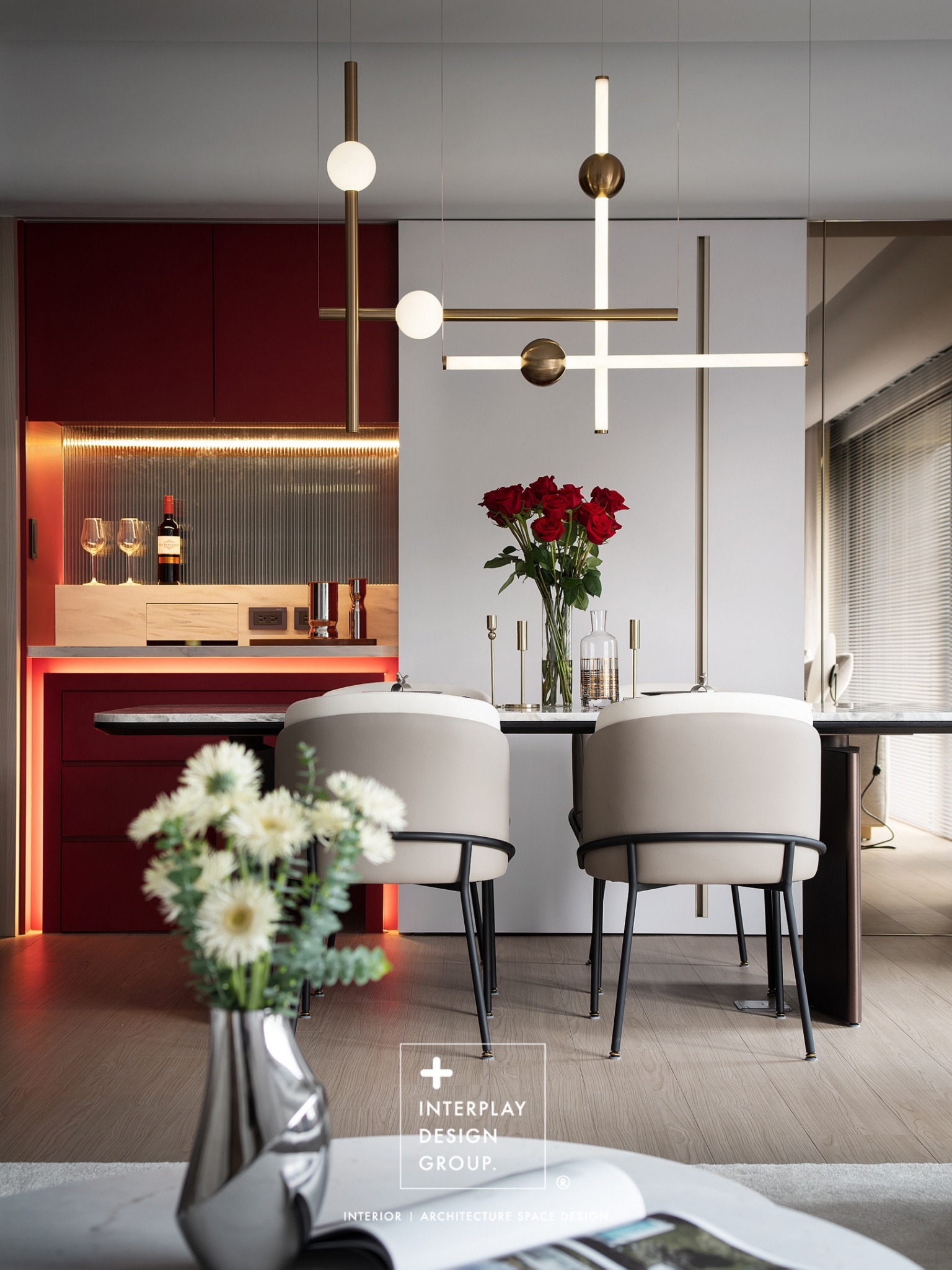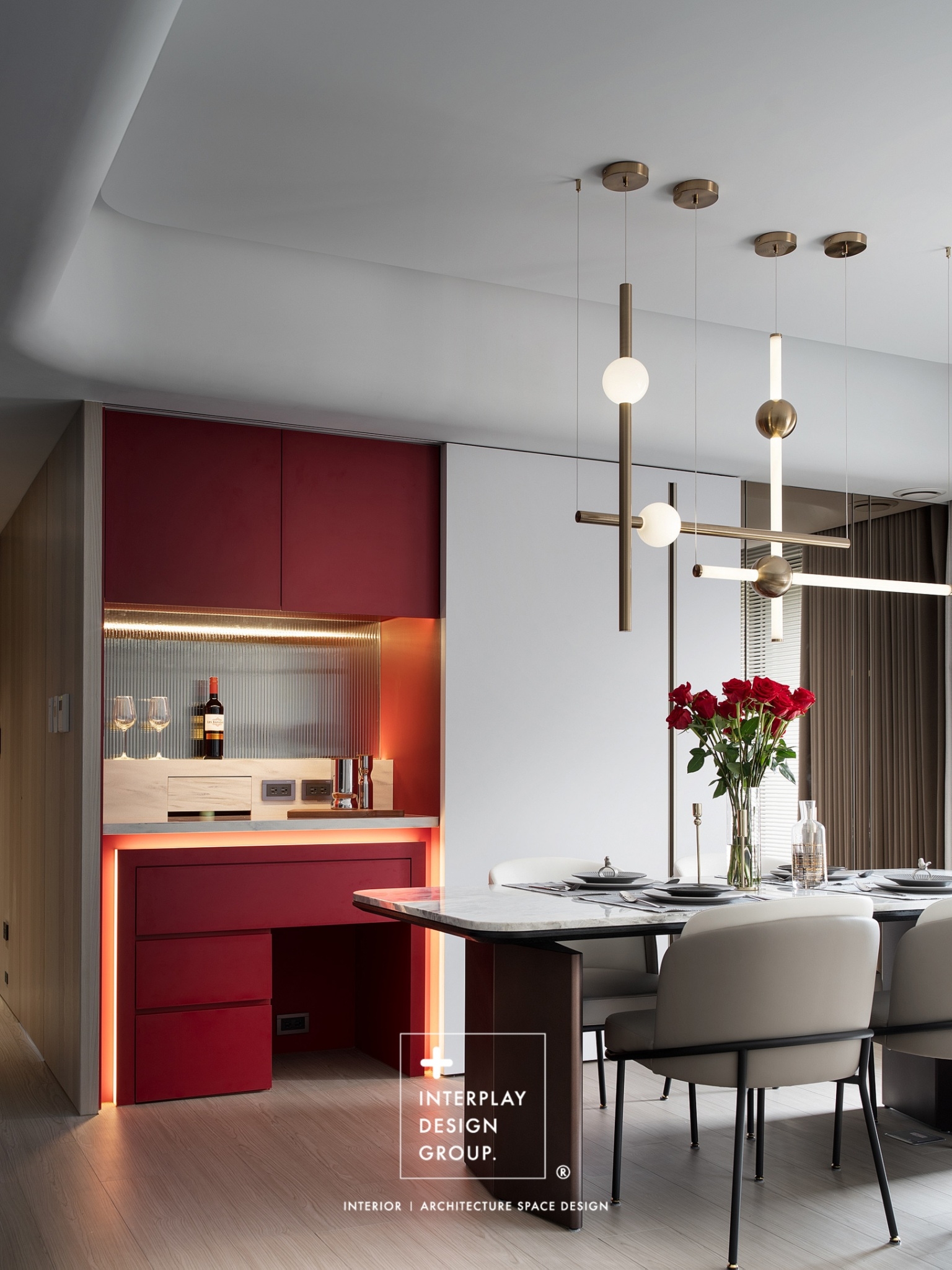 暖光從底部隱約透出,映照著深紅色櫃體的沉穩與優雅,如同空間中一抹細緻的情緒。大理石餐桌邊,米白色餐椅靜靜排列,線條柔和,氣質,卻蘊含溫潤的力量。 桌上的紅玫瑰輕巧點綴,在色系中釋放出一絲柔情。整體氛圍乾淨而有節奏,光與色、實與虛,共同編織出一段靜謐而有情感溫度的生活場景。