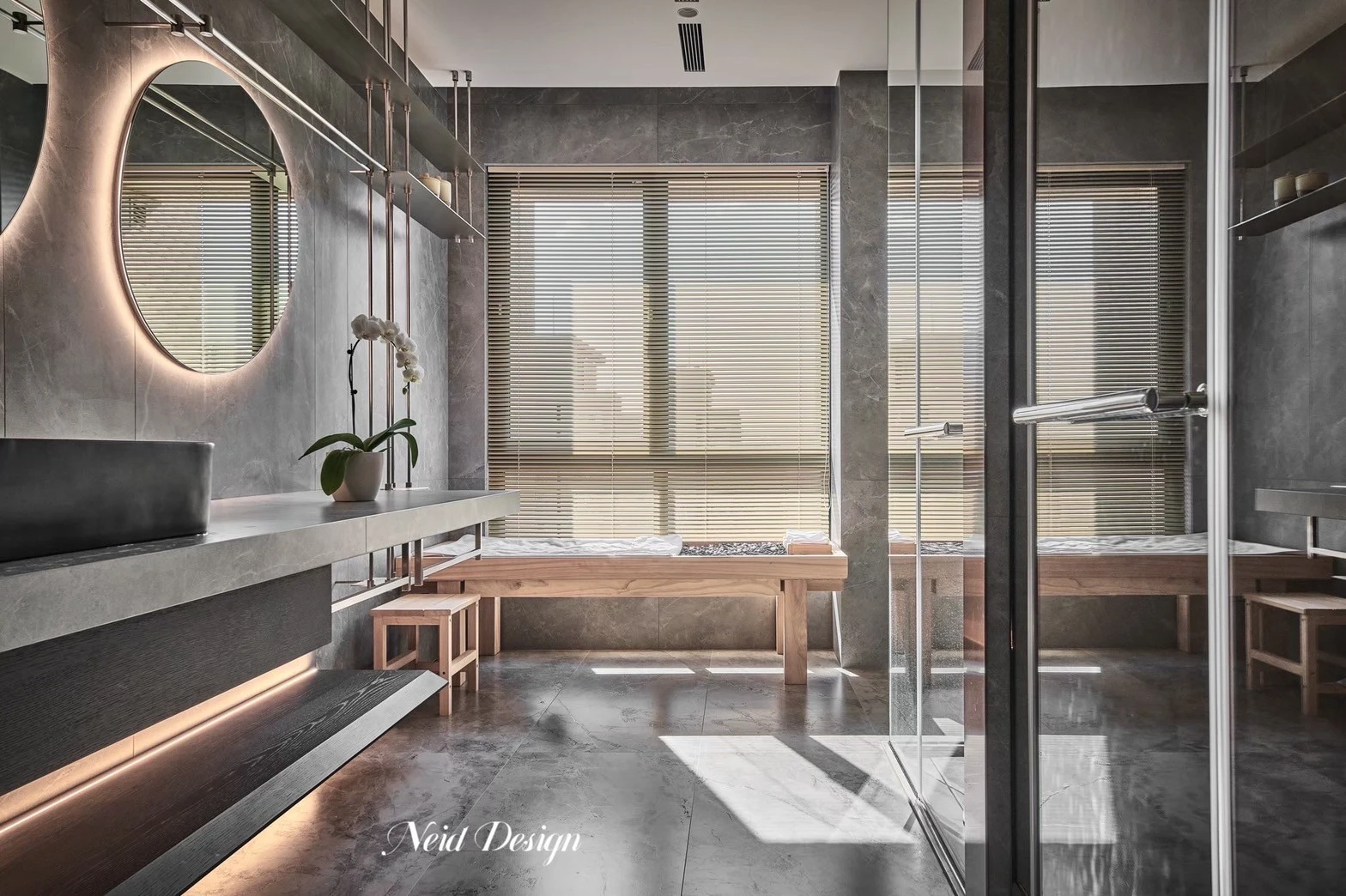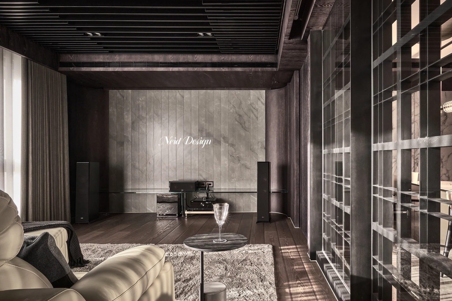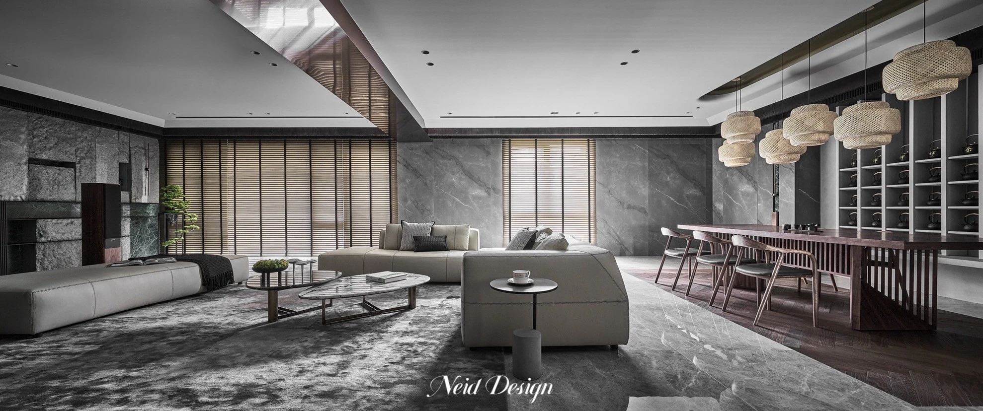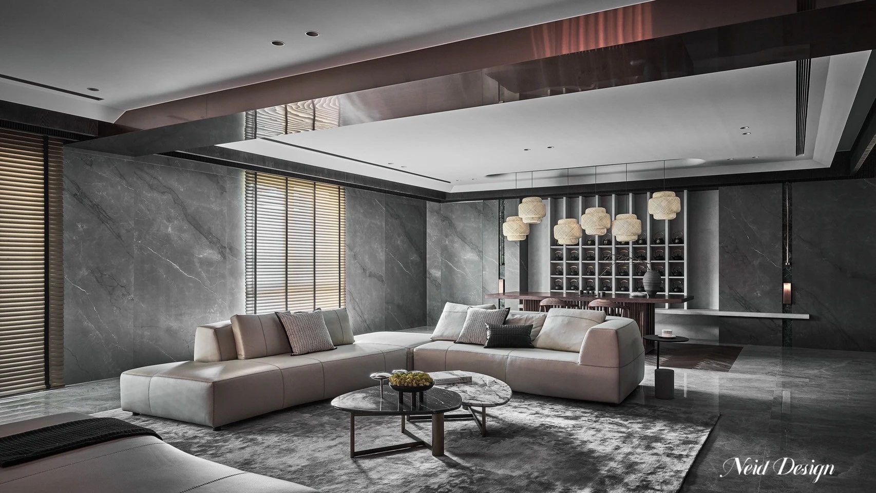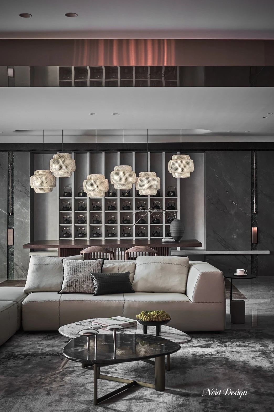 靜鋪展在灰白交錯的空間中。低伏的米白色沙發以溫柔的弧度圍合出一方自在,靠墊隨意擺放,像是輕聲低語的片段。圓形石材茶几輕盈錯落,將客廳的節奏拉得更柔緩。 牆面以深灰石紋鋪陳,穩定了空間的氣場,而遠方整齊排列的展示架,像靜默的時光櫃,收藏著細水流長的日常。空間之中,光影、材質與家具,輕輕交織成一首靜謐而深遠的詩。