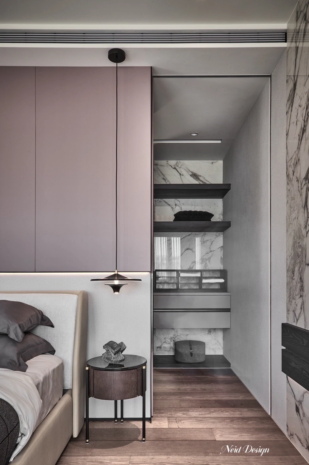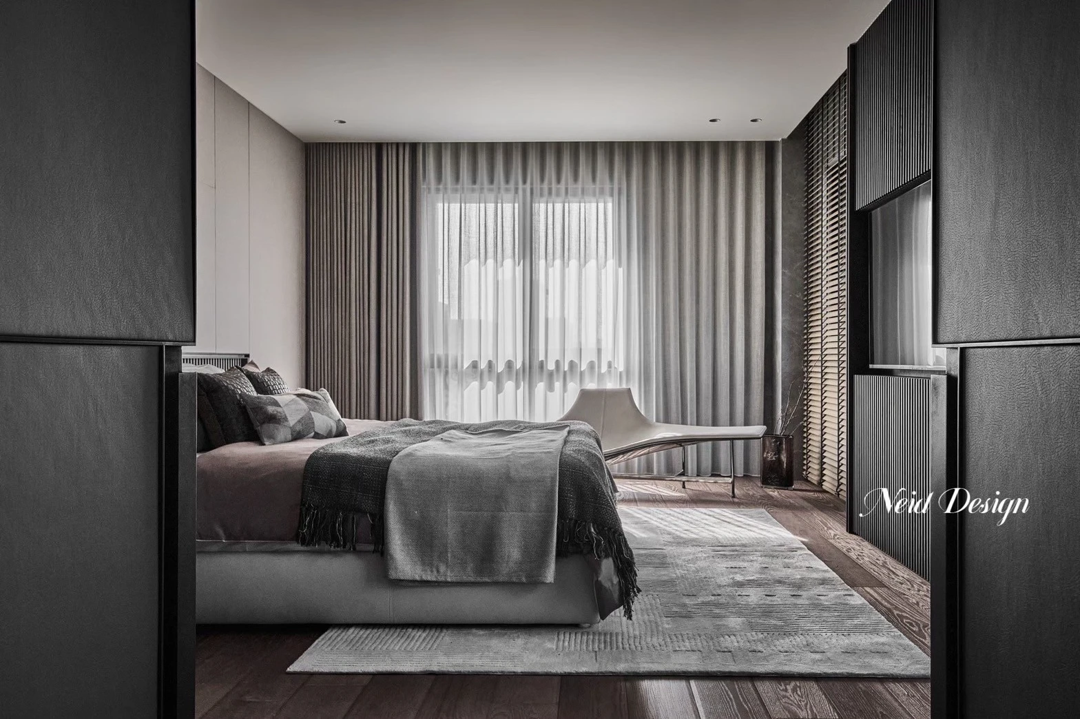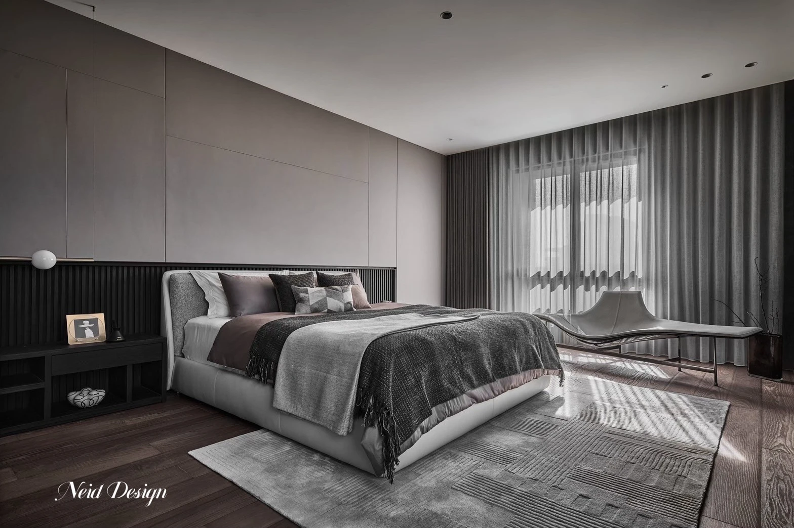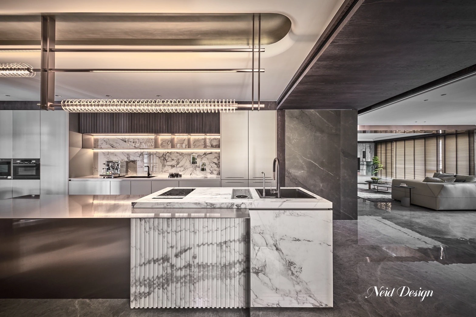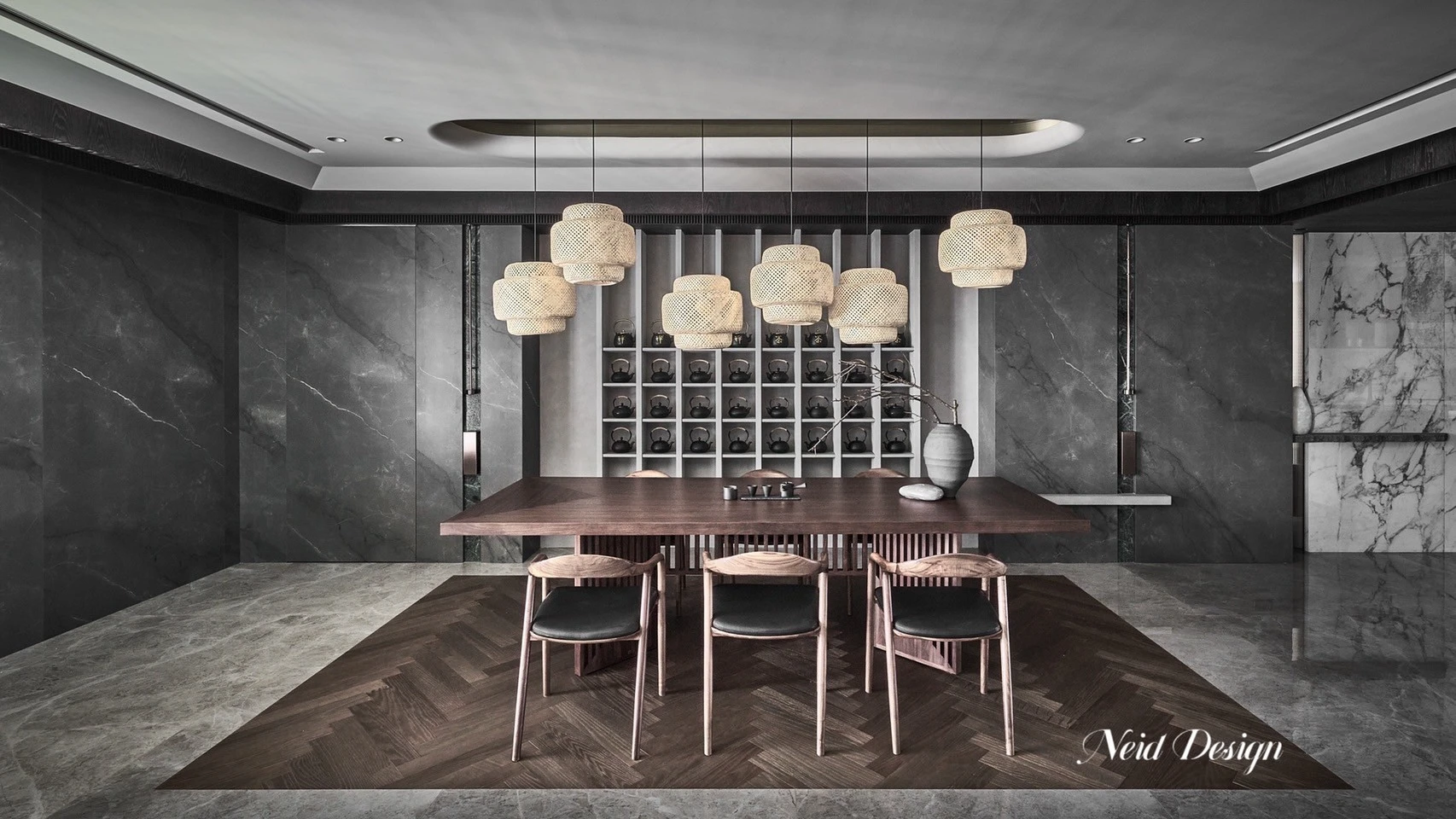 靜鋪展在灰白交錯的空間中。低伏的米白色沙發以溫柔的弧度圍合出一方自在,靠墊隨意擺放,像是輕聲低語的片段。圓形石材茶几輕盈錯落,將客廳的節奏拉得更柔緩。 牆面以深灰石紋鋪陳,穩定了空間的氣場,而遠方整齊排列的展示架,像靜默的時光櫃,收藏著細水流長的日常。空間之中,光影、材質與家具,輕輕交織成一首靜謐而深遠的詩。