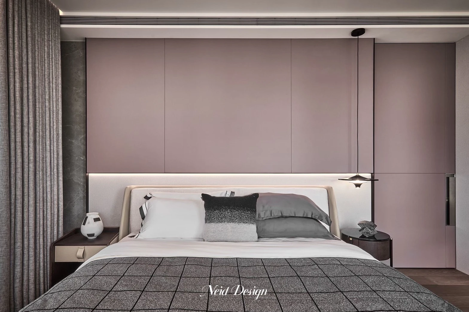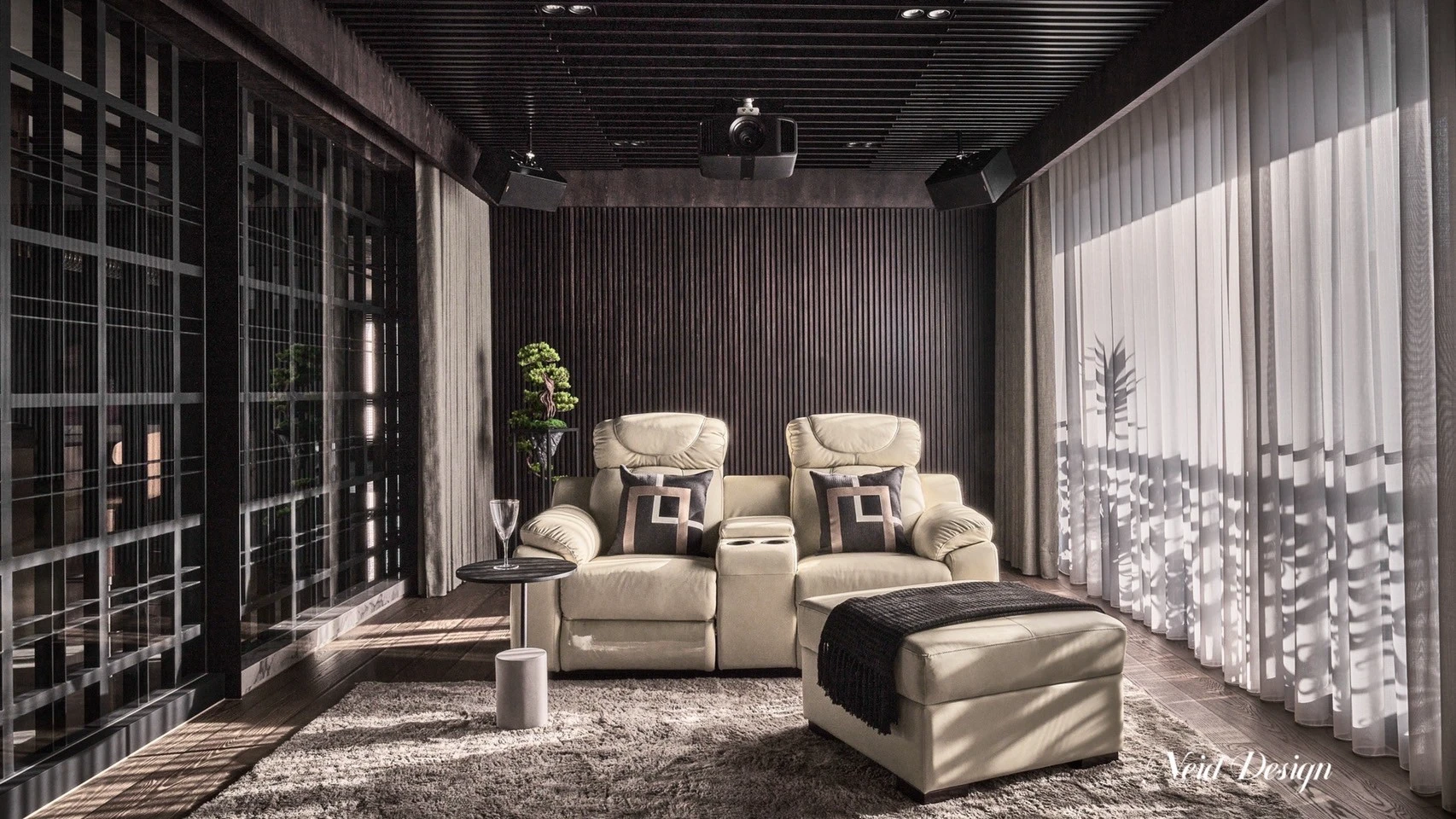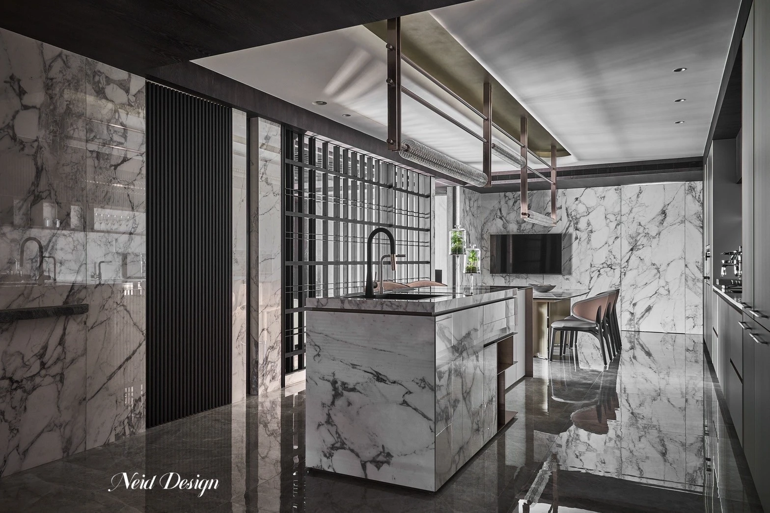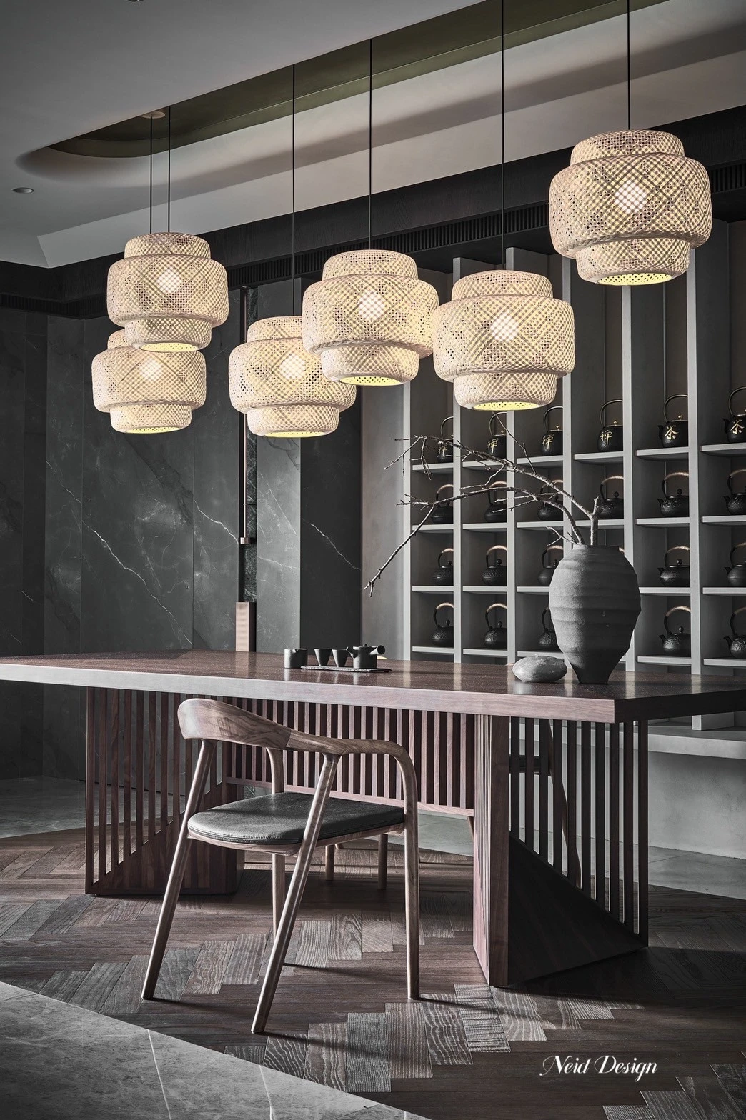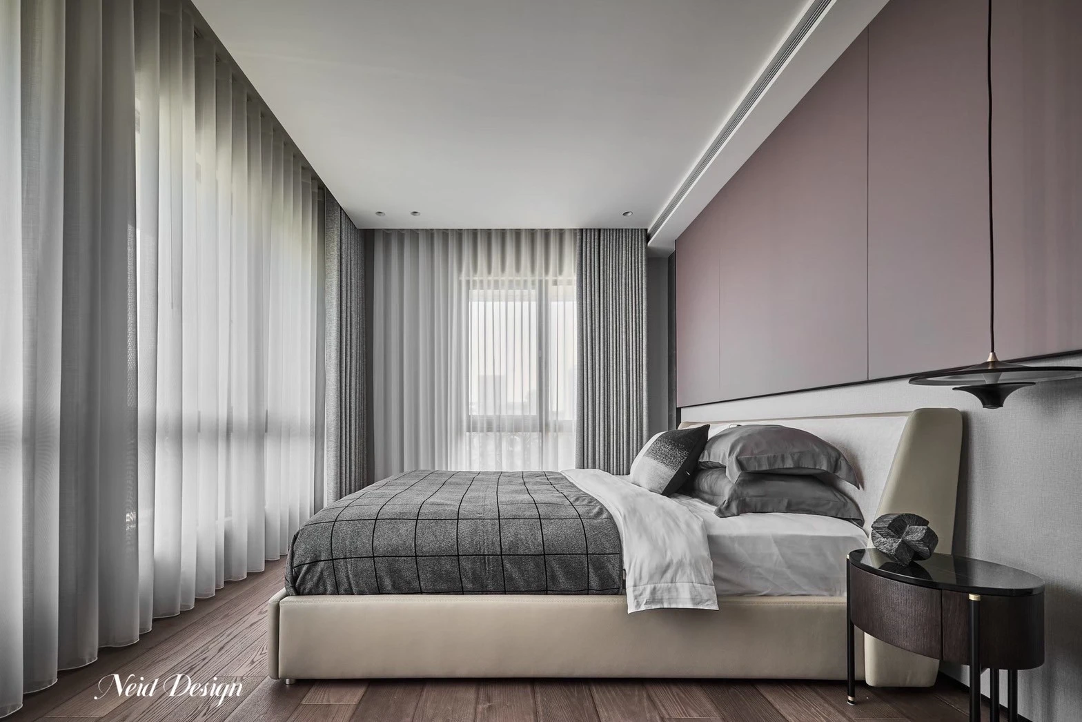靜鋪展在灰白交錯的空間中。低伏的米白色沙發以溫柔的弧度圍合出一方自在,靠墊隨意擺放,像是輕聲低語的片段。圓形石材茶几輕盈錯落,將客廳的節奏拉得更柔緩。 牆面以深灰石紋鋪陳,穩定了空間的氣場,而遠方整齊排列的展示架,像靜默的時光櫃,收藏著細水流長的日常。空間之中,光影、材質與家具,輕輕交織成一首靜謐而深遠的詩。